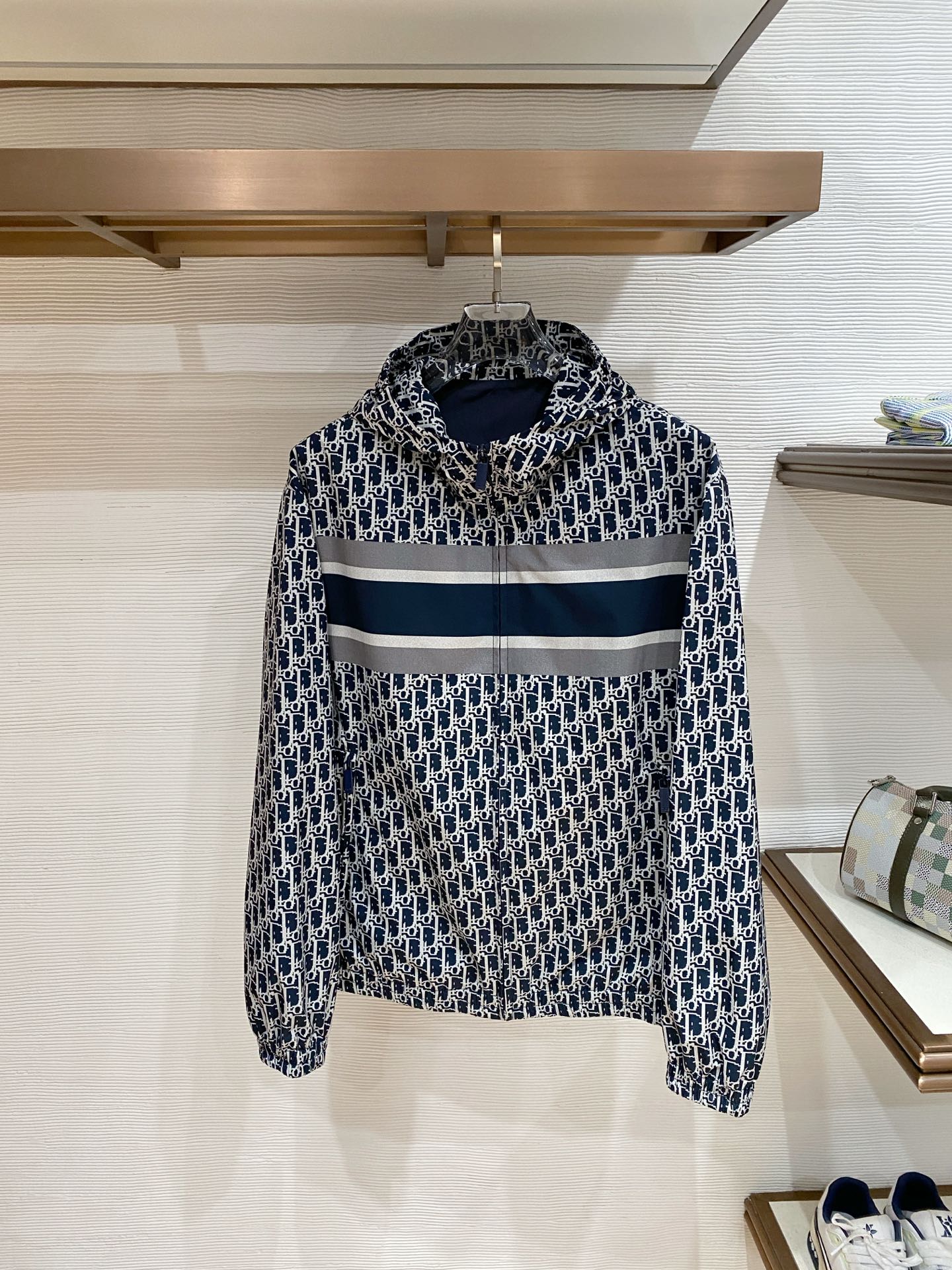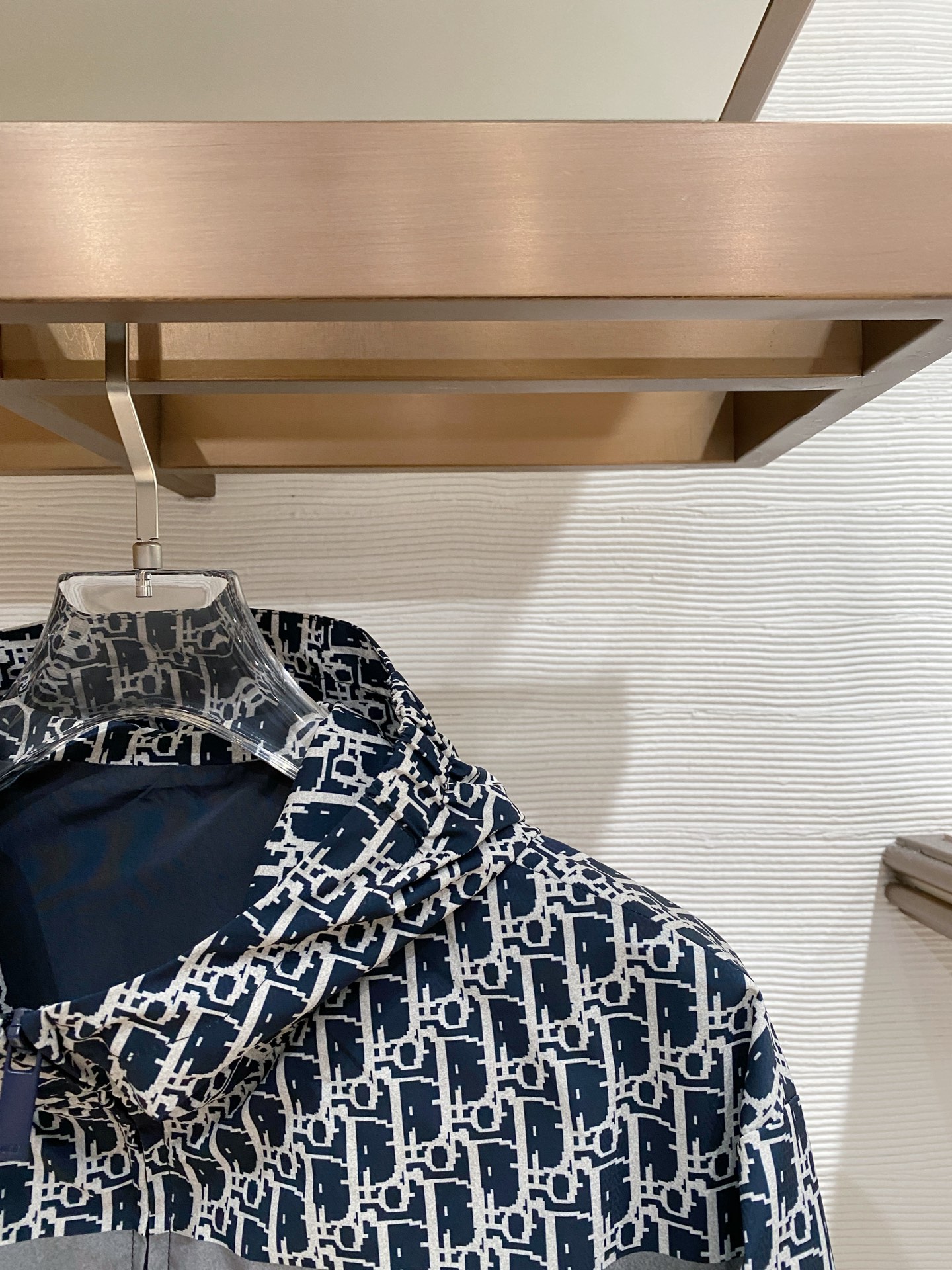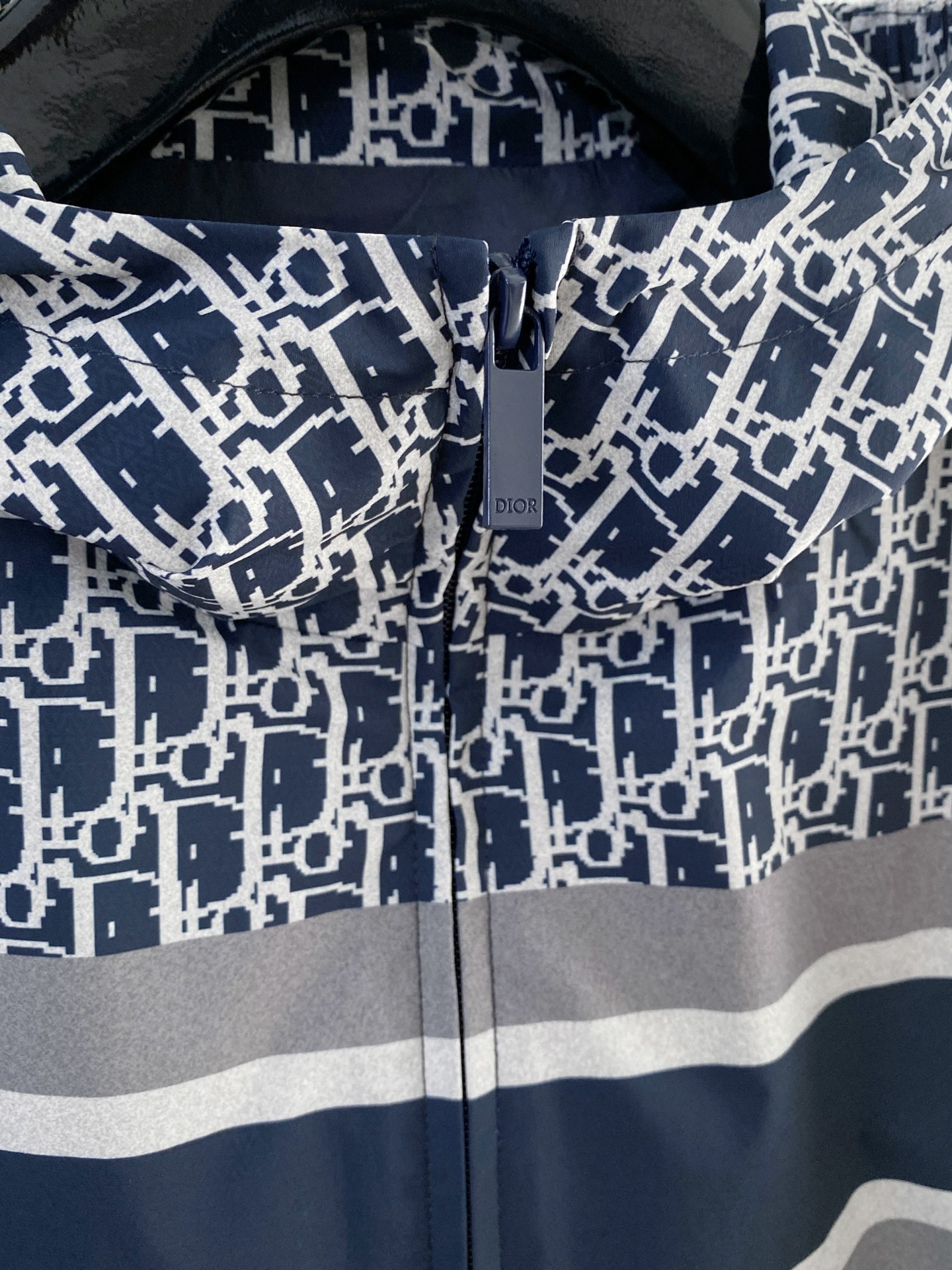 디올(Dior) 하우스의 아이코닉한 오블리크(Oblique) 자카드 모티프와 스포티한 가로 밴드 디테일이 조화를 이룬 테크니컬 후드 자켓입니다.