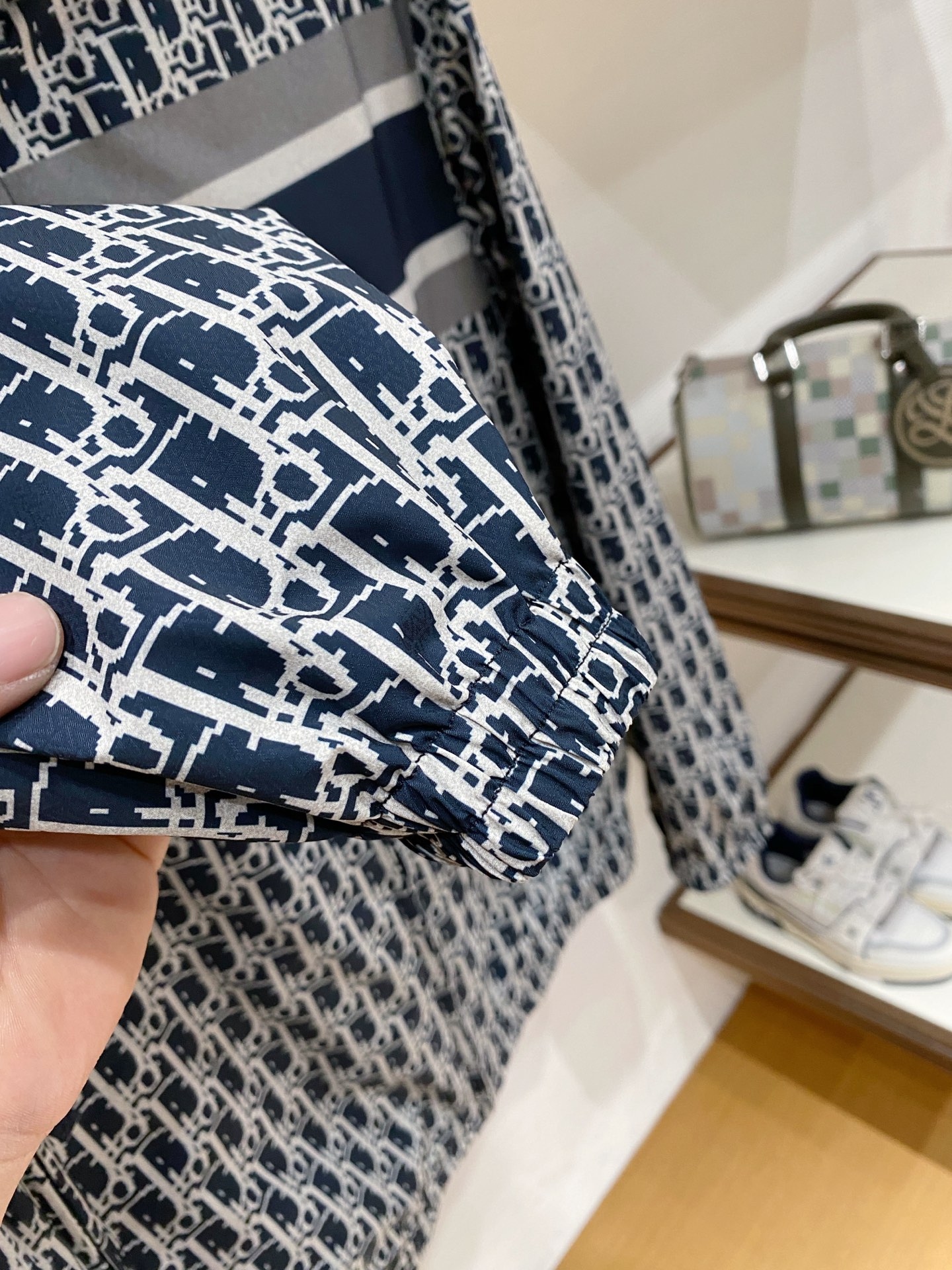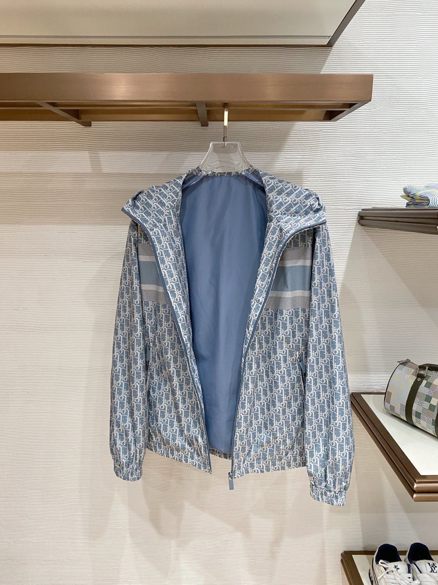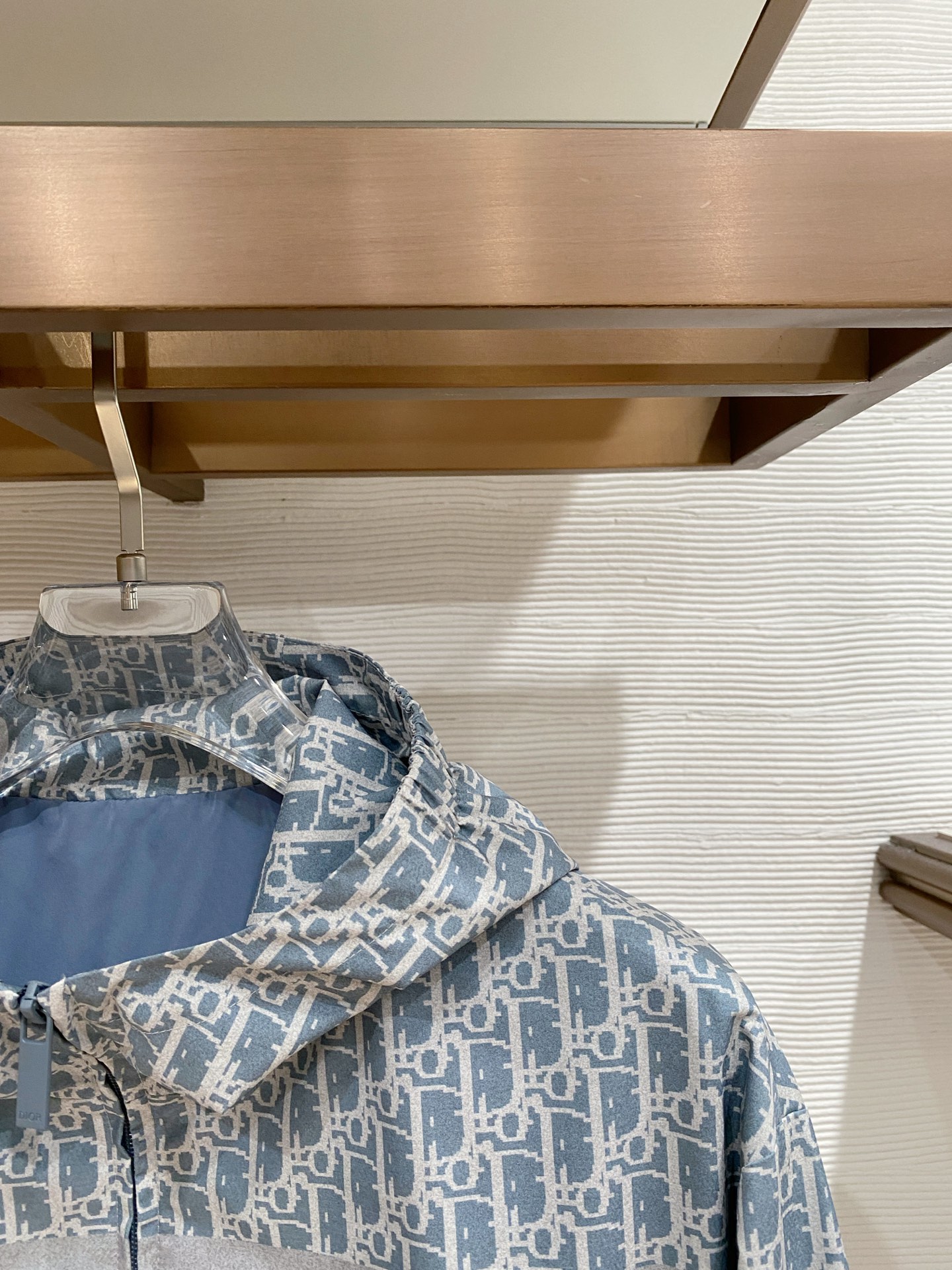 디올(Dior) 하우스의 아이코닉한 오블리크(Oblique) 자카드 모티프와 스포티한 가로 밴드 디테일이 조화를 이룬 테크니컬 후드 자켓입니다.
