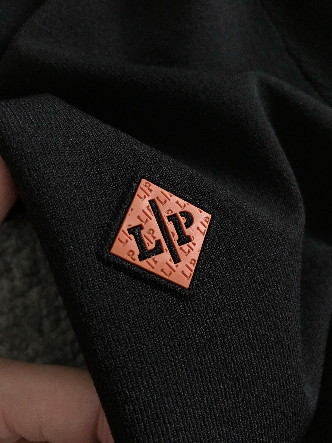 심플한 블랙 바디에 넥라인과 소매 끝단의 오렌지/브라운 배색 라인이 세련된 포인트를 주며, 가슴 부분의 정교한 골드 메탈 로고 장식이 브랜드만의 럭셔리한 정체성을 완성합니다.