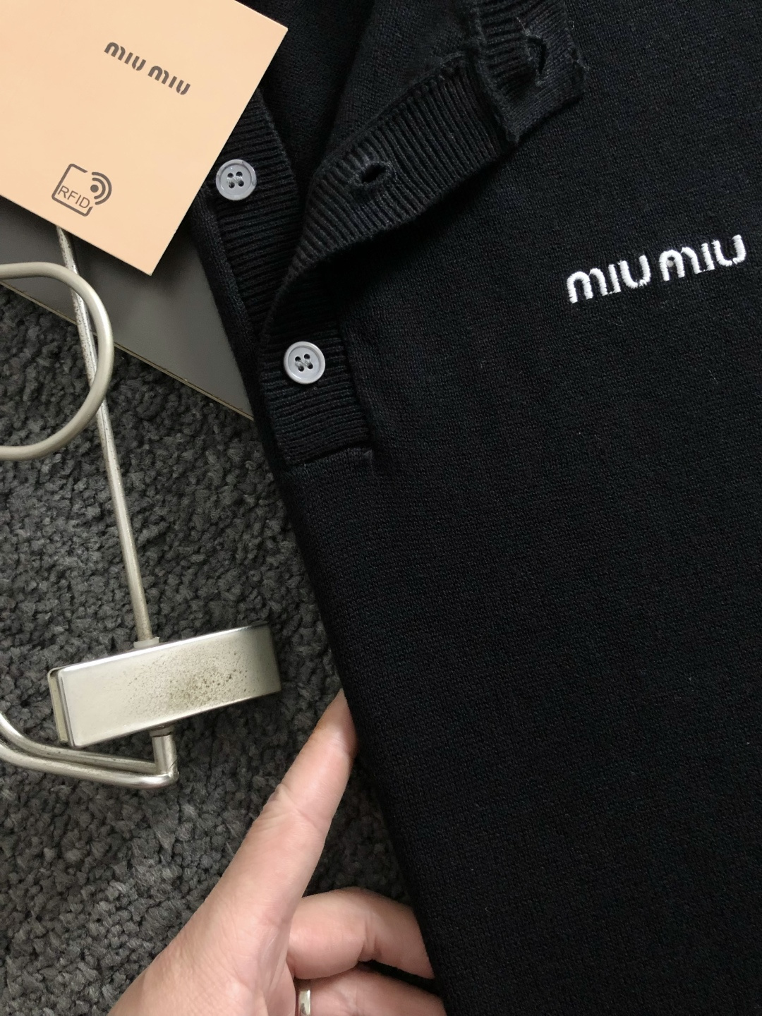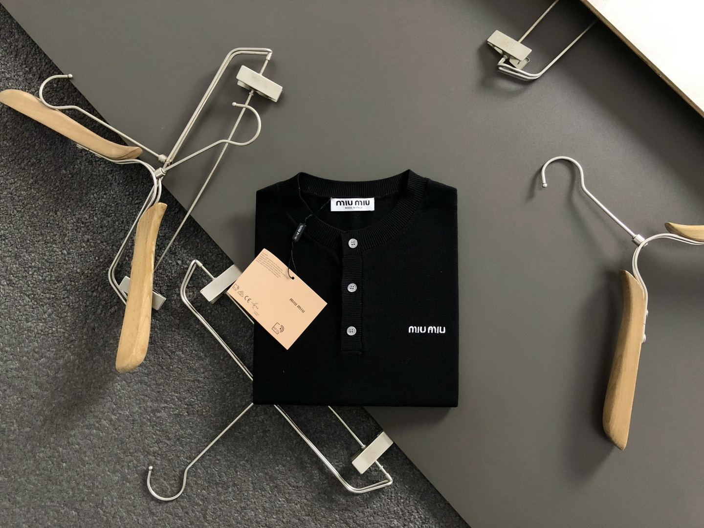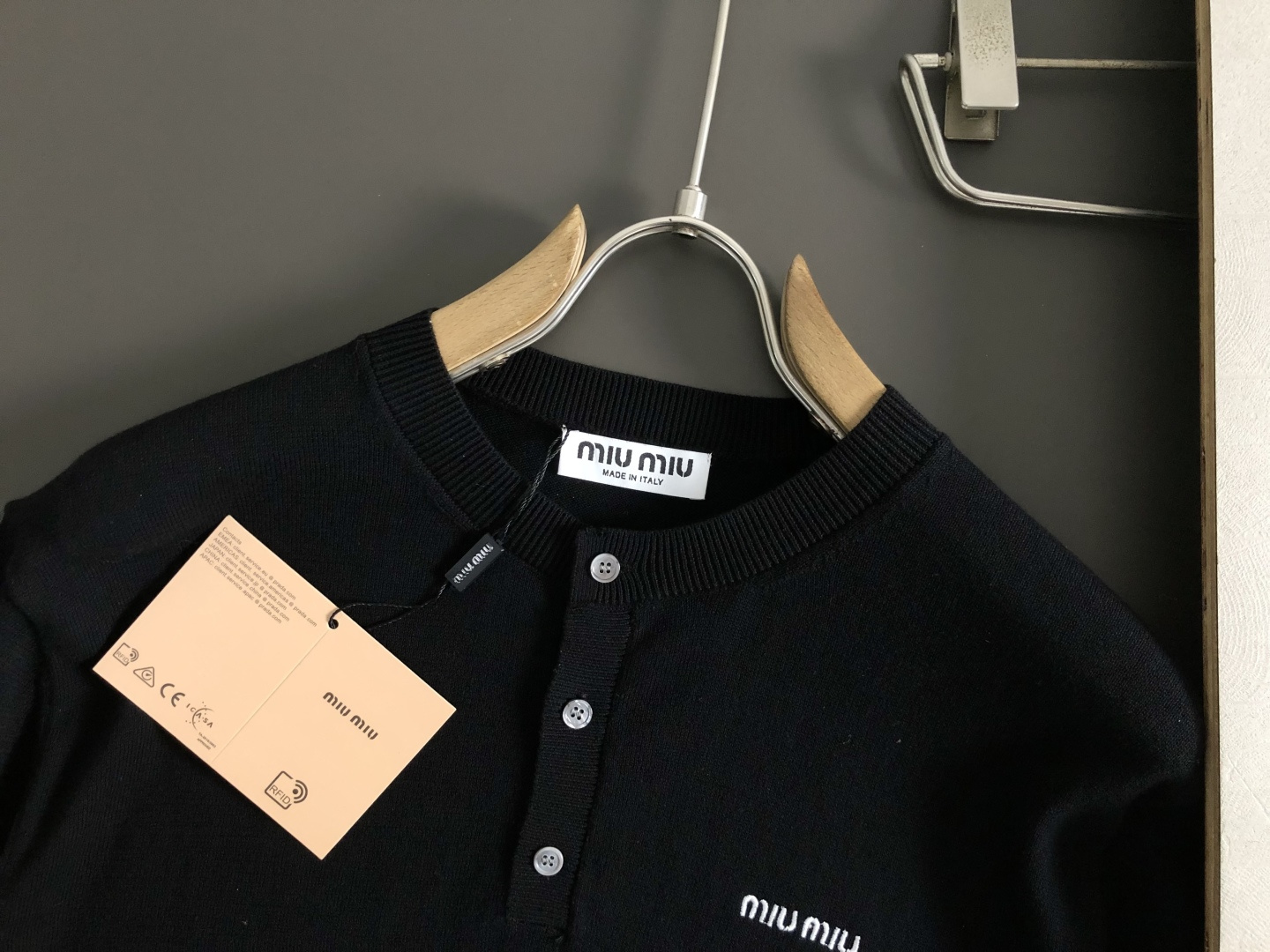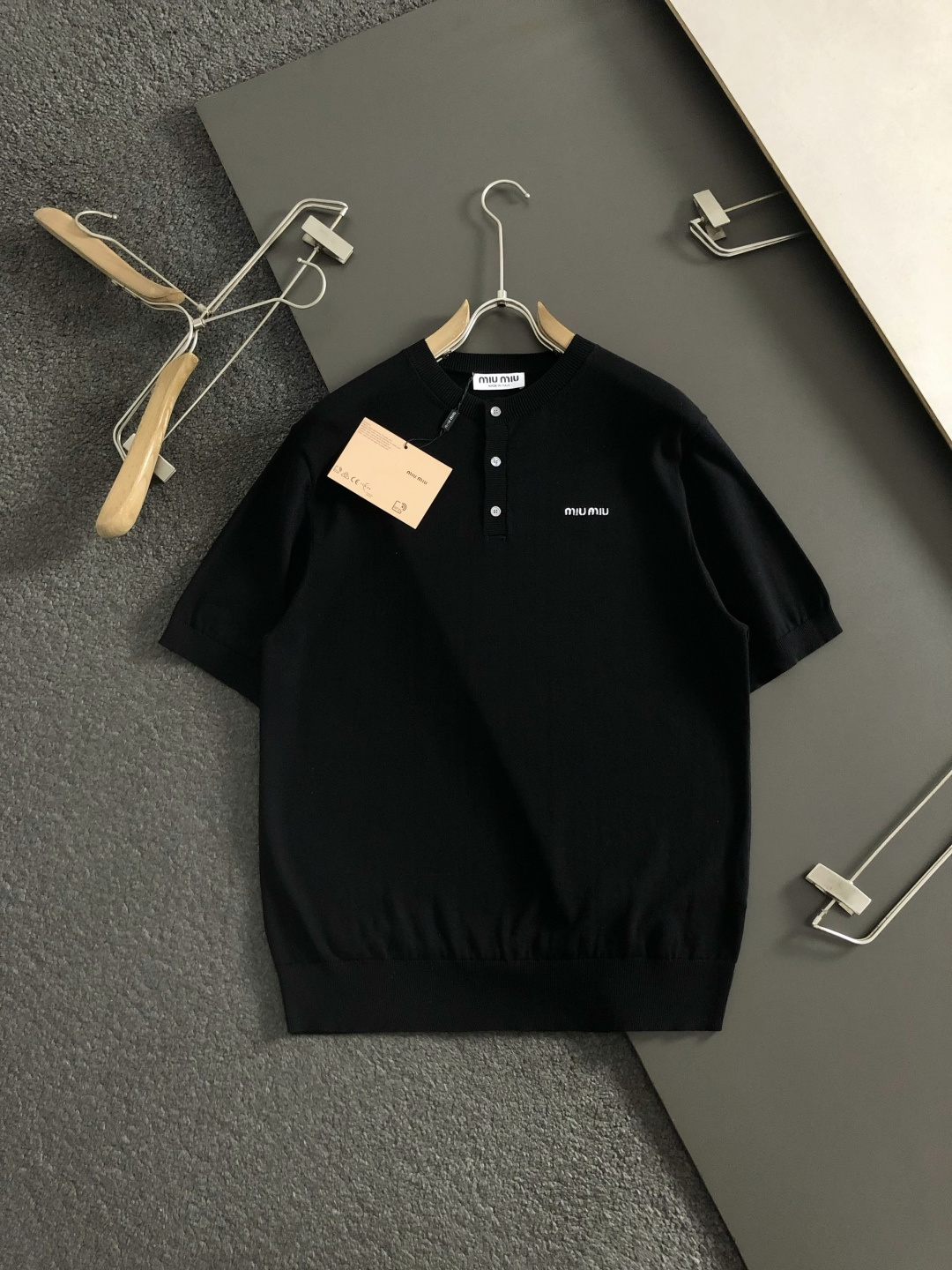 이탈리아 럭셔리 하우스 미우미우(Miu Miu) 특유의 미니멀하면서도 세련된 감성이 돋보이는 반팔 헨리넥 니트입니다.