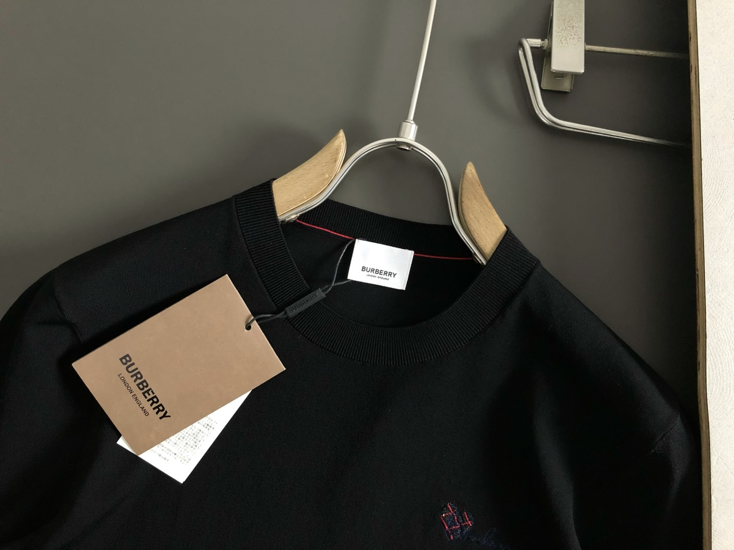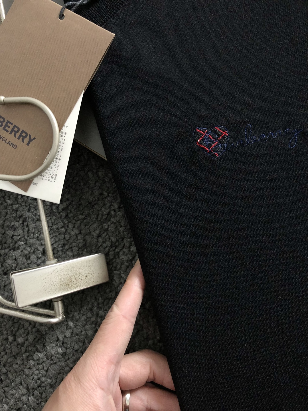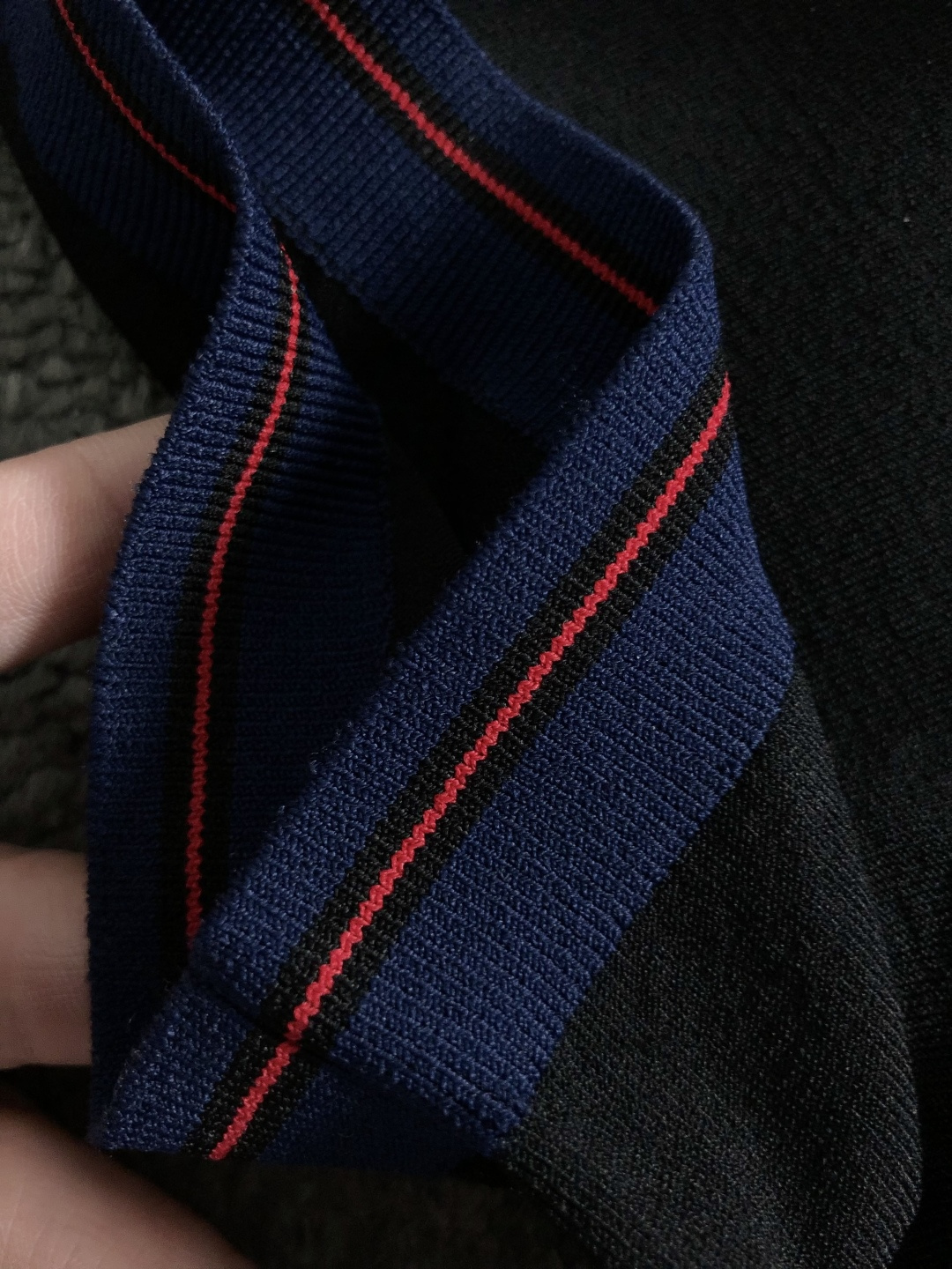 심플한 블랙 바디 가슴 부분에 버버리 특유의 미니 로고 자수가 은은하게 자리 잡고 있으며, 소매 끝단의 레드&블루 스트라이프 배색이 스포티하면서도 감각적인 위트를 더해줍니다.