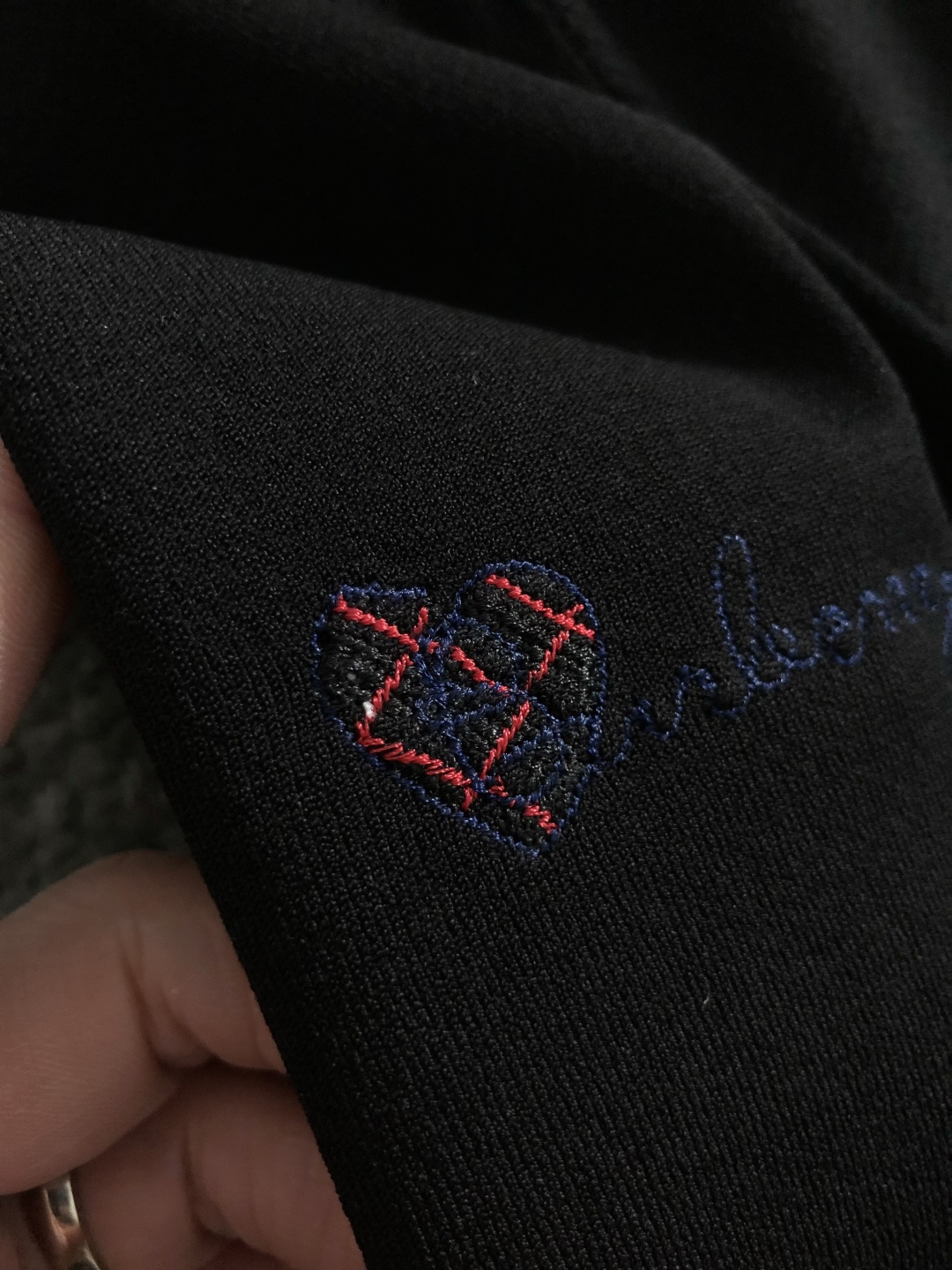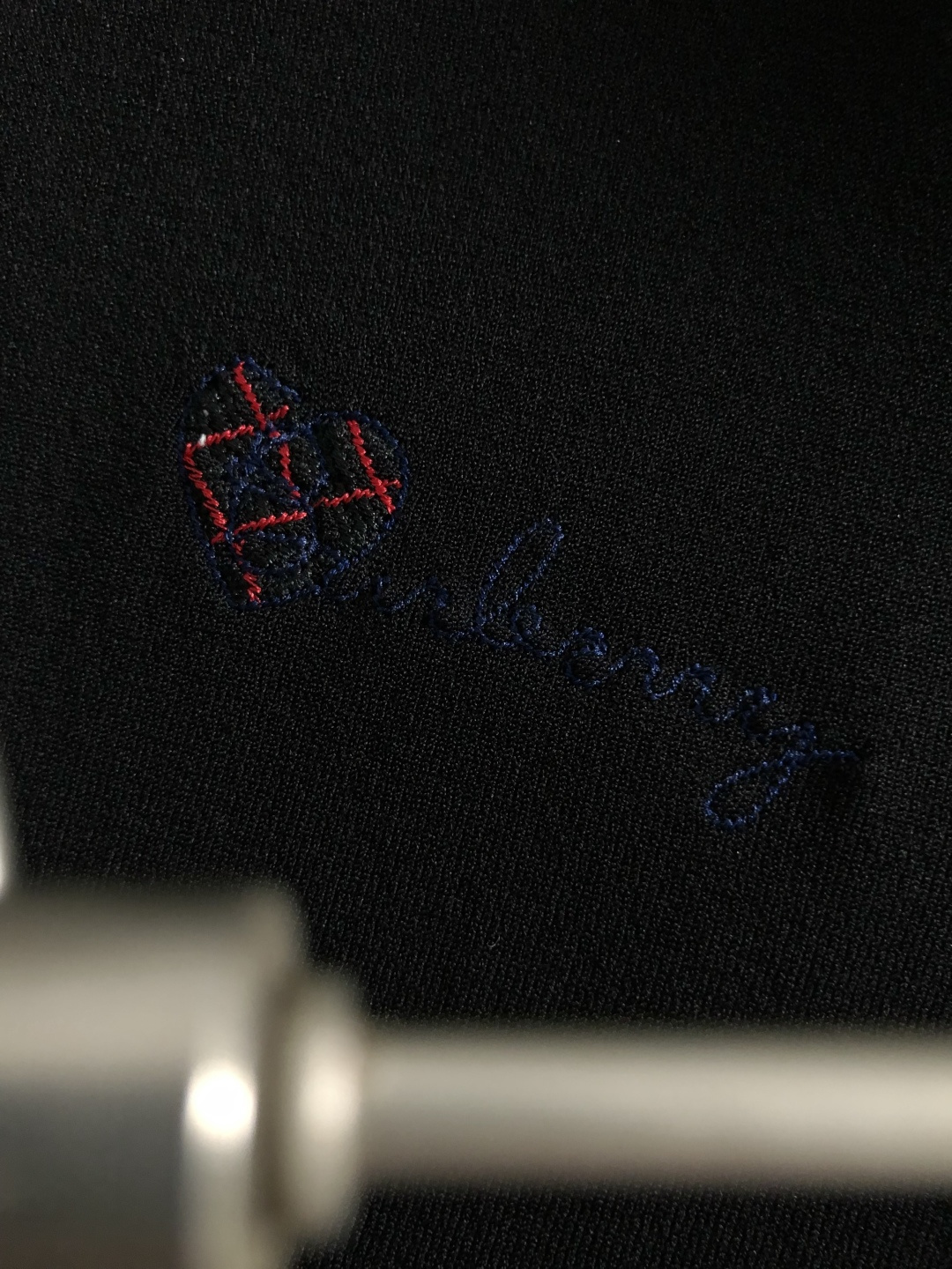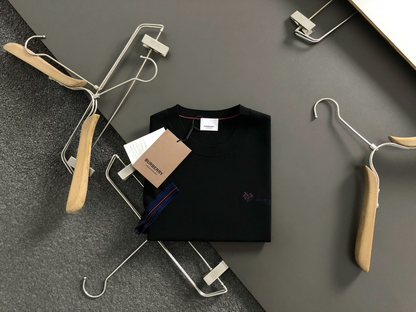 심플한 블랙 바디 가슴 부분에 버버리 특유의 미니 로고 자수가 은은하게 자리 잡고 있으며, 소매 끝단의 레드&블루 스트라이프 배색이 스포티하면서도 감각적인 위트를 더해줍니다.