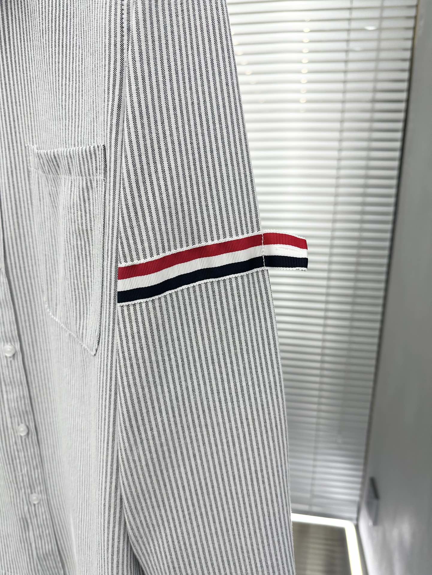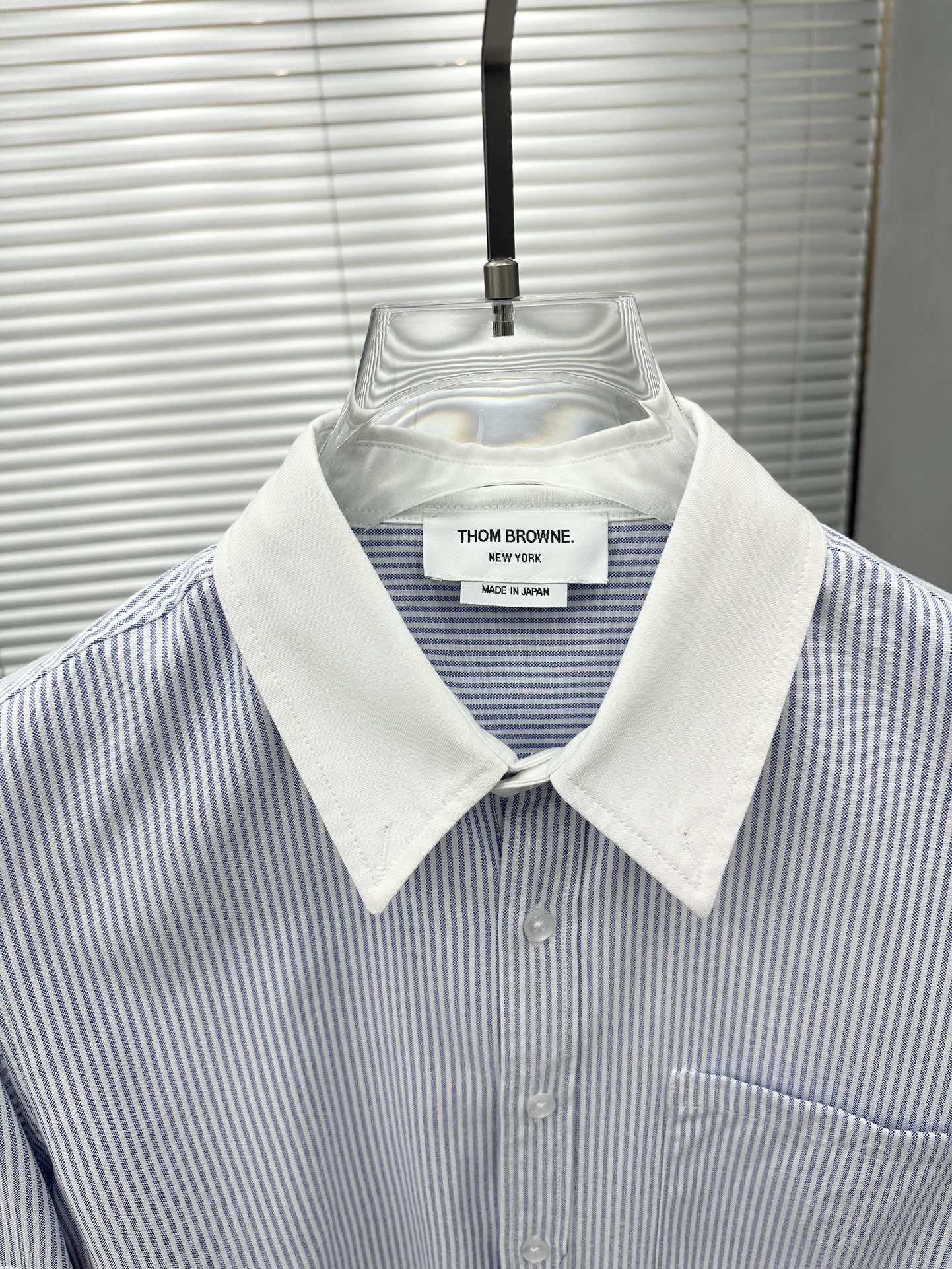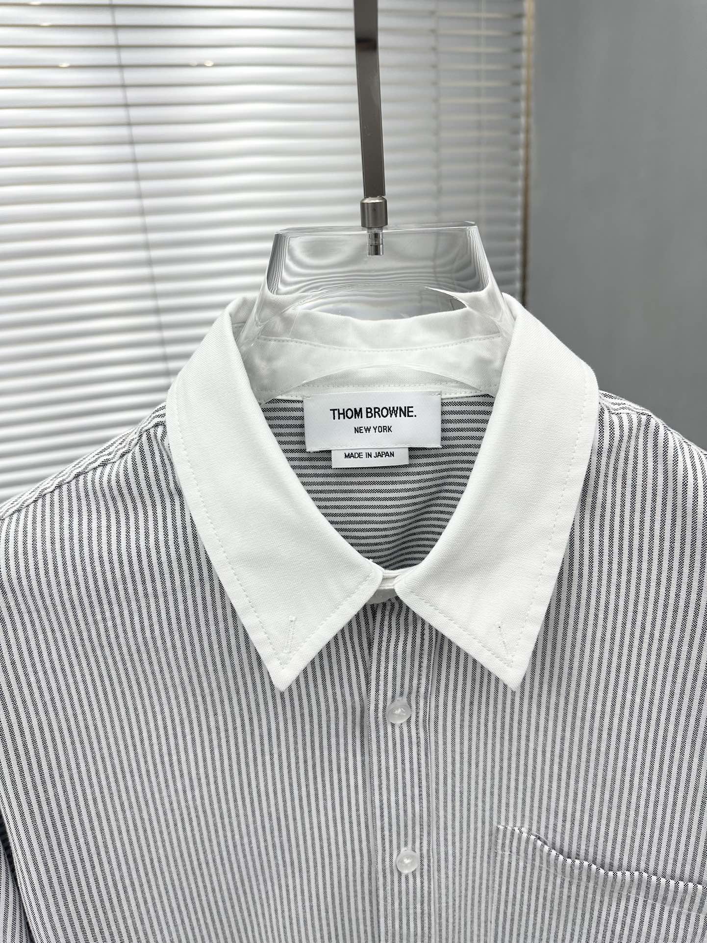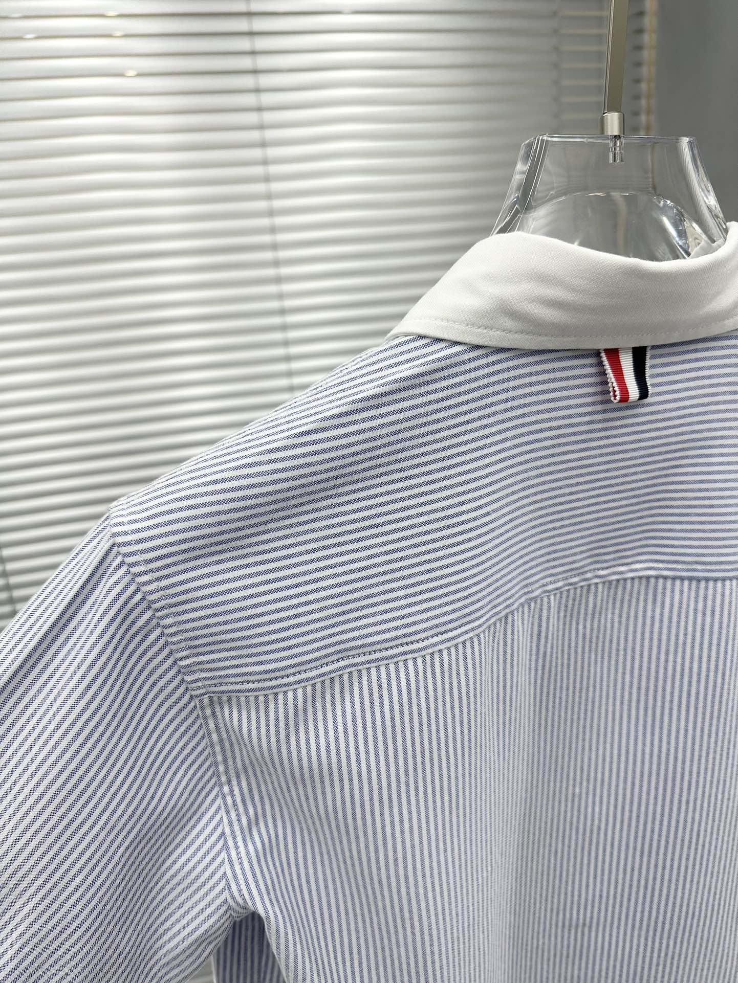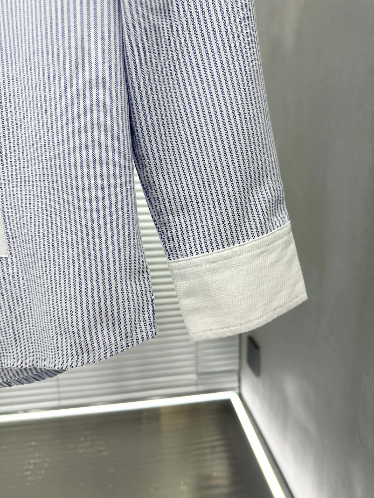 잔잔한 세로 스트라이프 패턴에 화이트 컬러의 콘트라스트 칼라와 커프스를 매치하여 단정하면서도 세련된 분위기를 연출합니다.