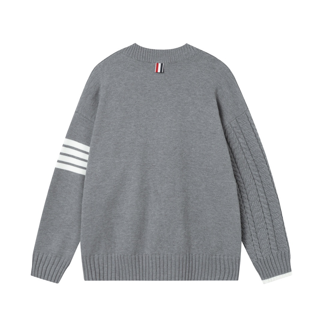 정면을 기준으로 한쪽은 클래식한 평조직, 다른 한쪽은 입체적인 케이블 꽈배기 조직을 믹스하여 유니크한 비대칭 실루엣을 완성했습니다. 넥라인과 밑단의 화이트 배색 포인트, 소매의 시그니처 화이트 4-바(4-Bar) 완장이 브랜드의 정체성을 강조하며, 최고급 울 소재를 사용하여 포근하고 고급스러운 착용감을 선사하는 남녀공용(Unisex) 프리미엄 아이템입니다.