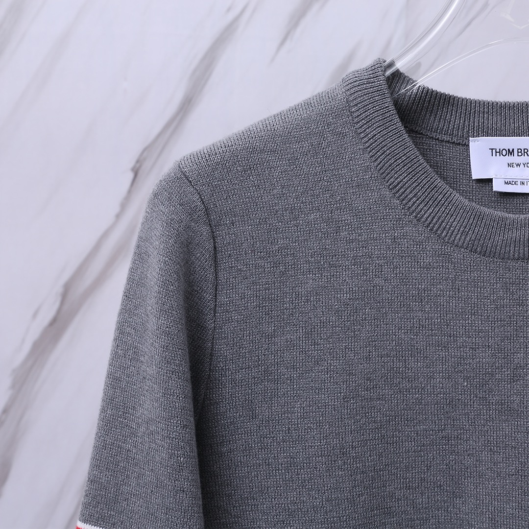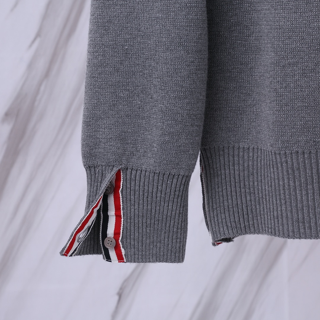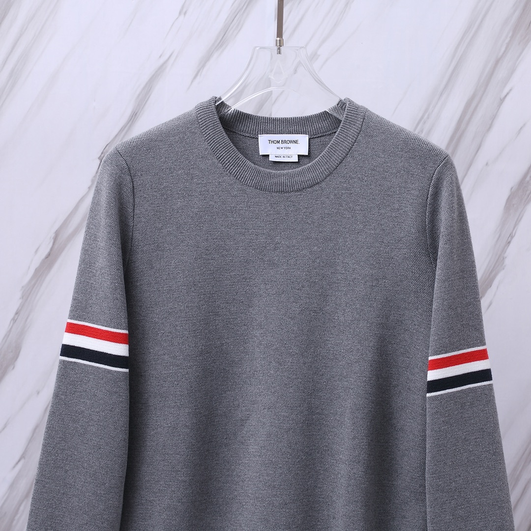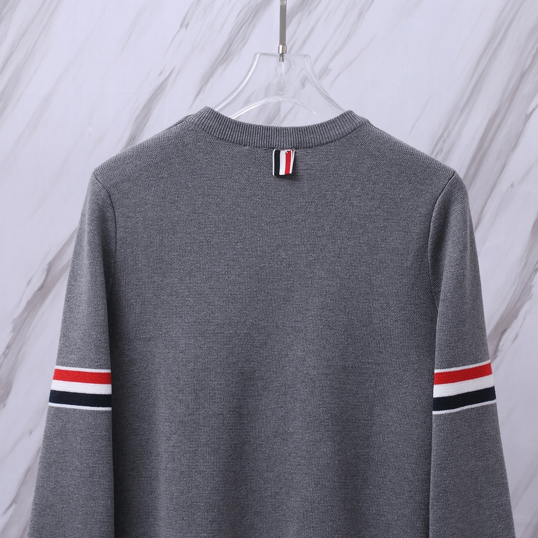 톰브라운의 클래식한 무드가 담긴 삼색 라인 암밴드 크루넥 니트입니다.