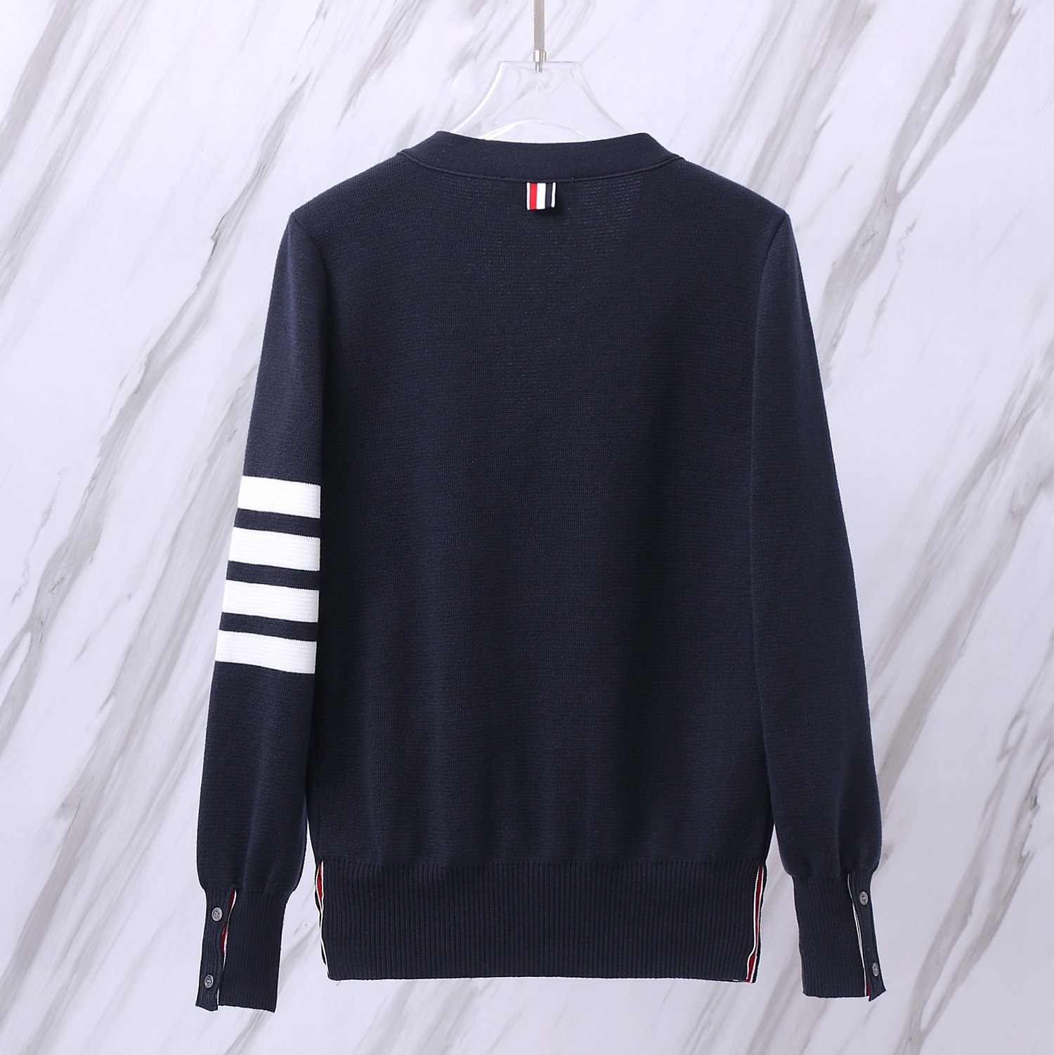 왼쪽 소매의 시그니처 화이트 4-선 완장과 단추 라인의 삼색(RWB) 그로스그레인 디테일이 브랜드의 정체성을 완성합니다. 세련된 V넥 실루엣과 정갈한 핏으로 데일리 룩부터 비즈니스 캐주얼까지 폭넓게 활용 가능한 남녀공용(Unisex) 프리미엄 아이템입니다.