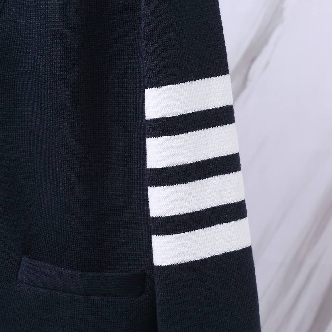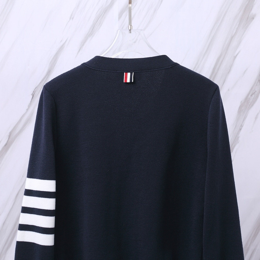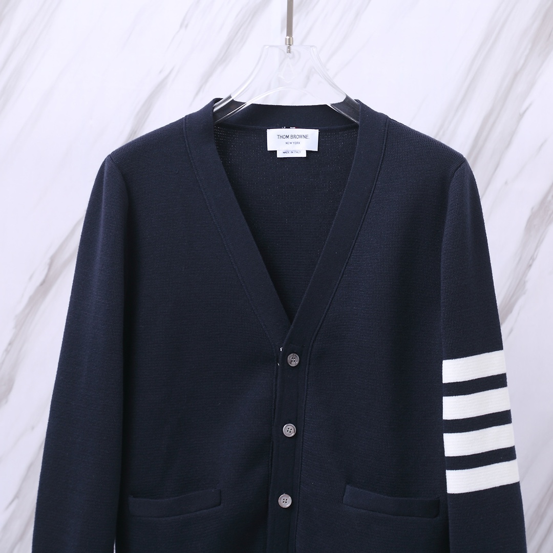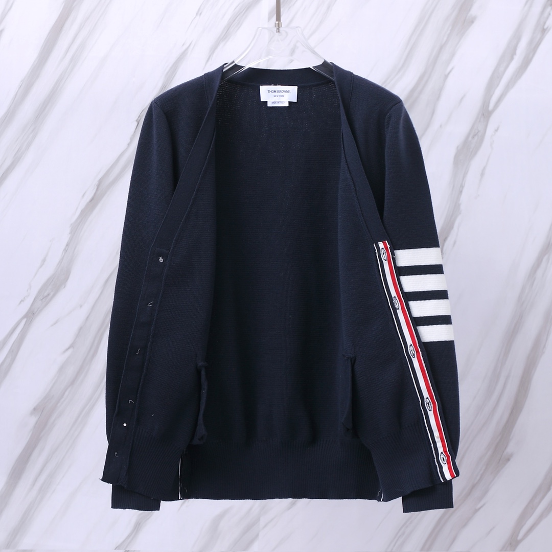 톰브라운의 상징적인 디자인이 돋보이는 클래식 4-바 암밴드 가디건입니다.