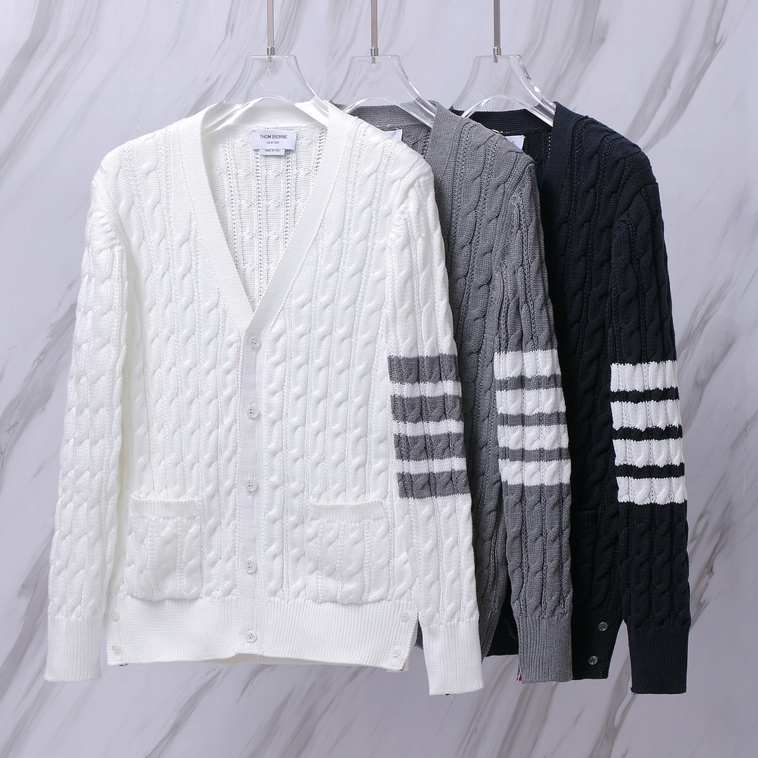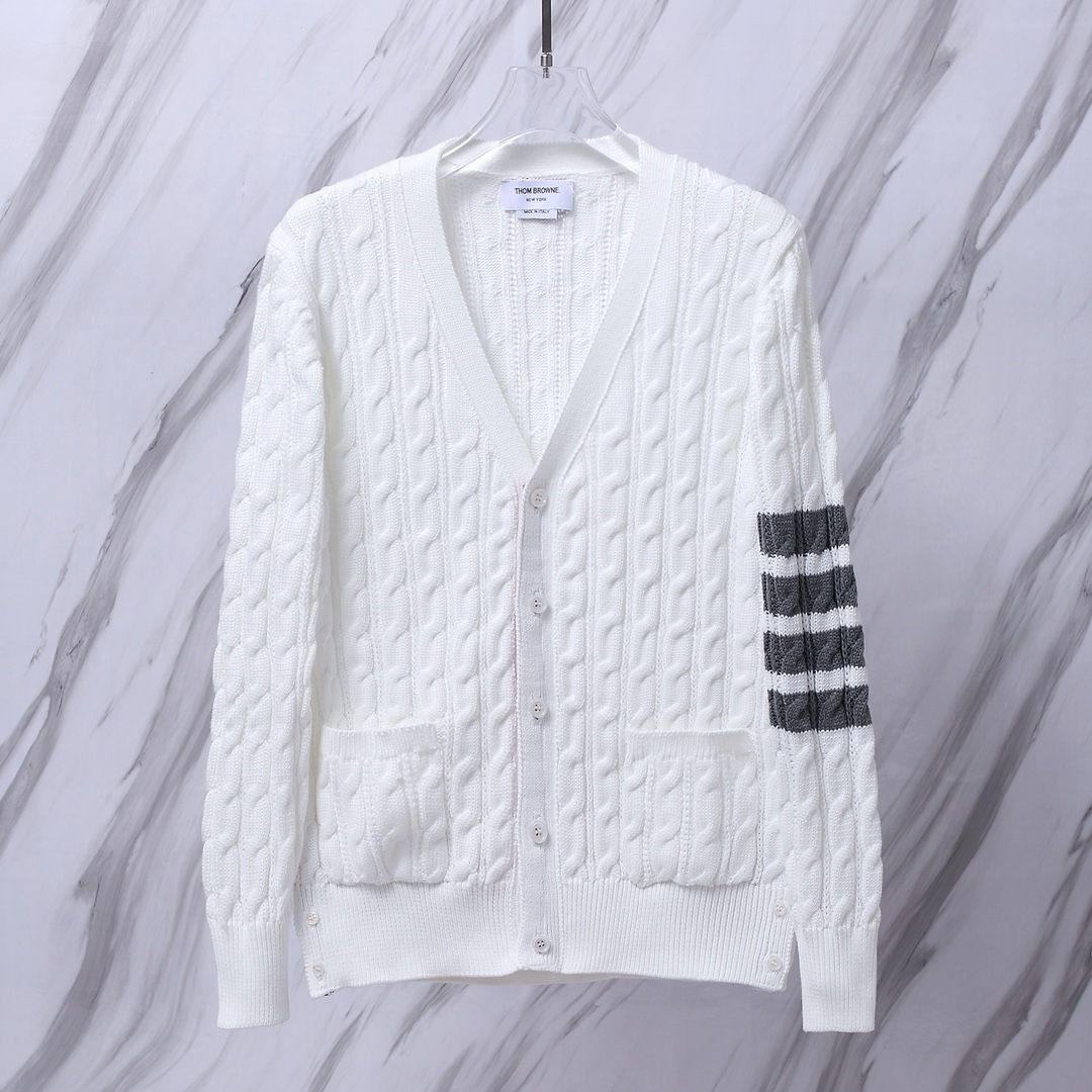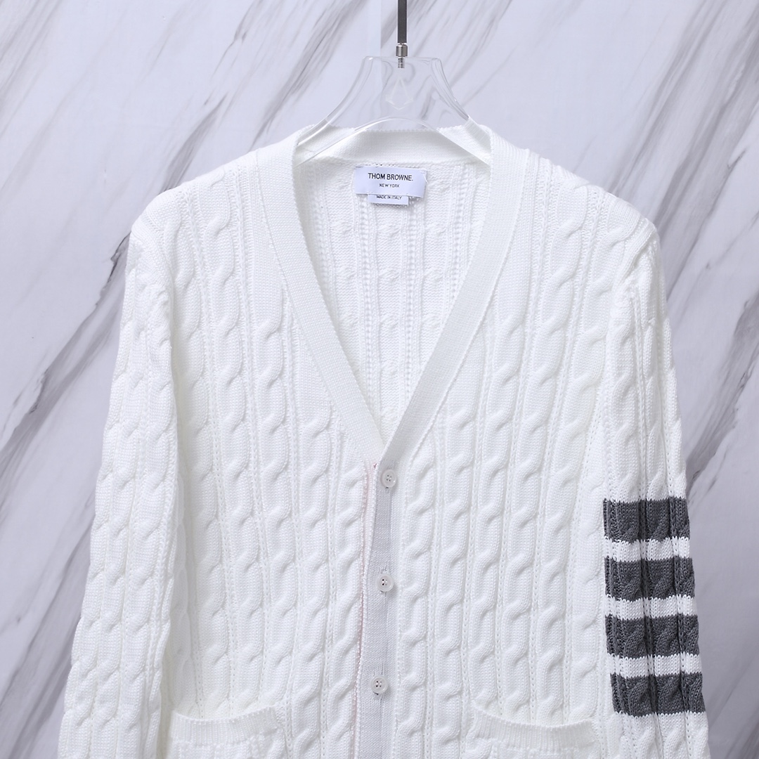 톰브라운의 시그니처가 집약된 **클래식 4-바 케이블 니트 가디건**입니다.