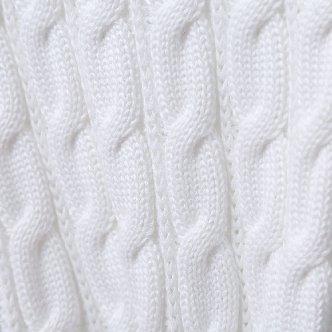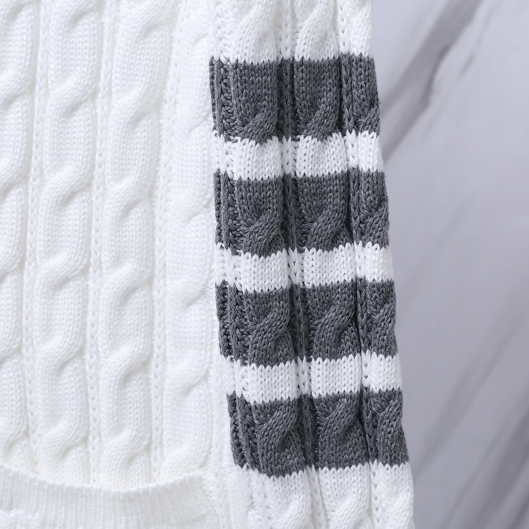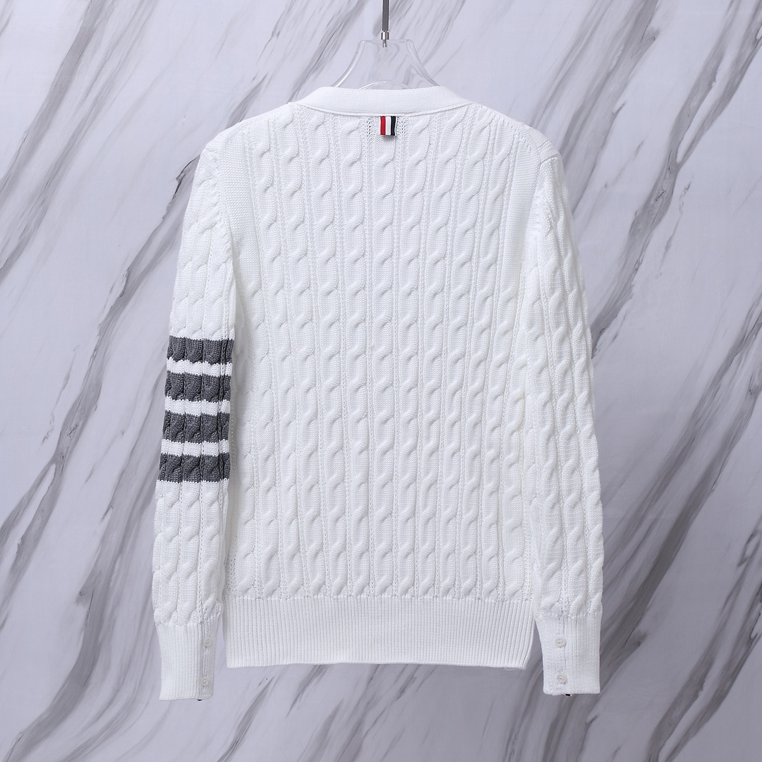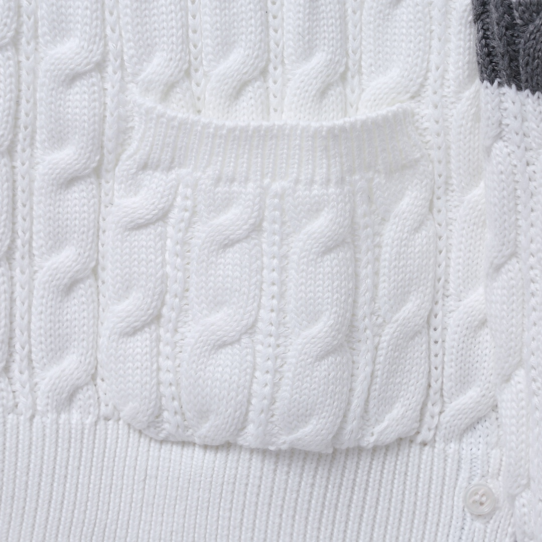 입체감 있는 케이블 짜임과 소매의 4-선 화이트 완장, 그리고 단추 라인의 삼색 그로스그레인 디테일이 조화를 이룹니다. 고급스러운 V넥 라인과 정갈한 실루엣으로 다양한 스타일링에 활용하기 좋은 **남녀공용(Unisex)** 프리미엄 아이템입니다.