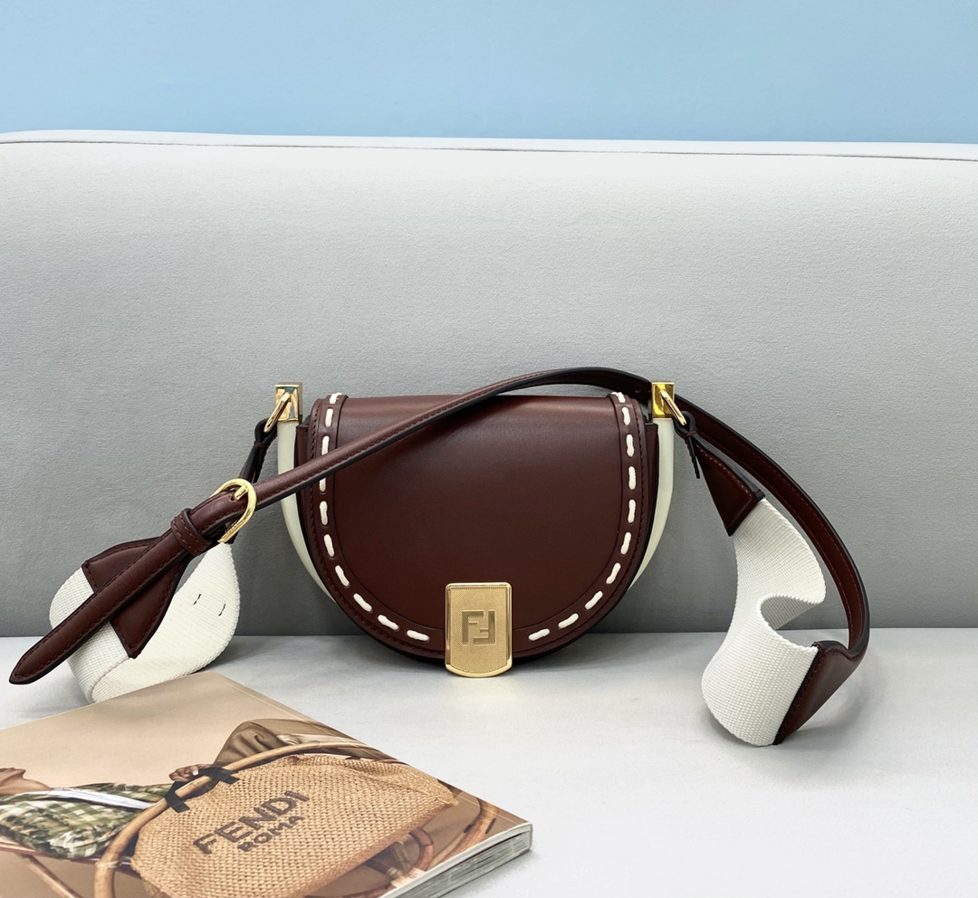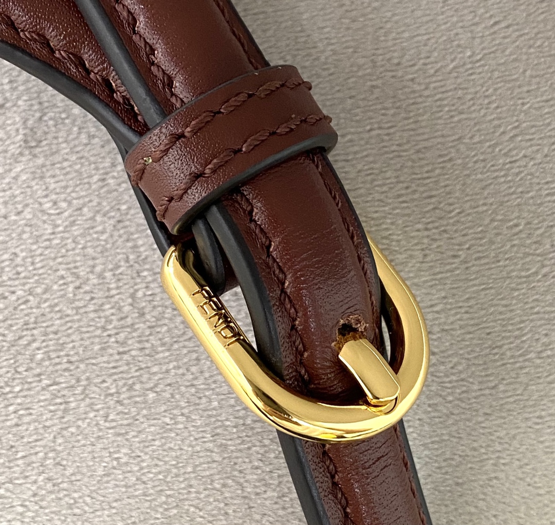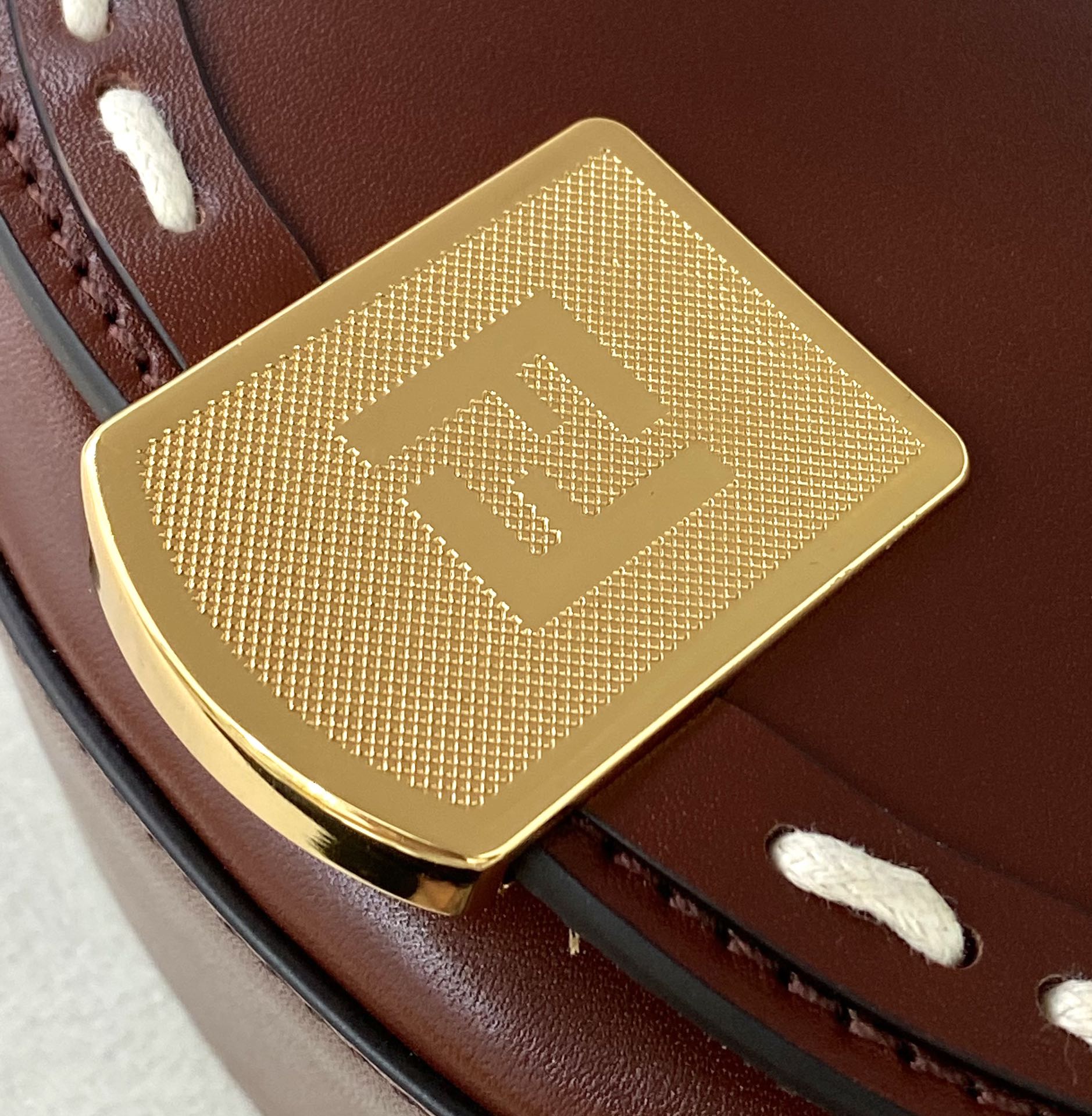 매끄러운 브라운 가죽 바디와 대비되는 화이트 스티치 디테일이 세련된 무드를 완성하며, 전면의 빈티지한 골드 톤 FF 로고 클로저가 브랜드 고유의 럭셔리함을 더합니다.
