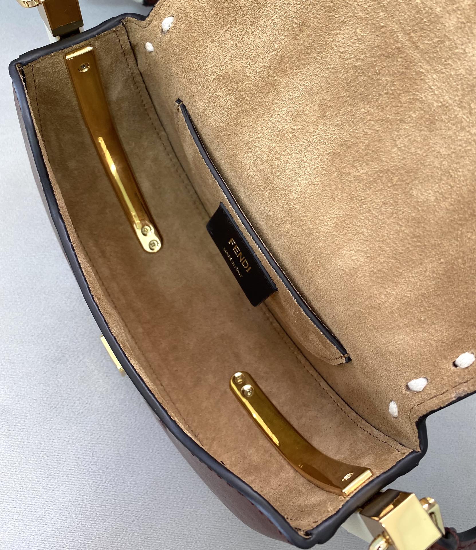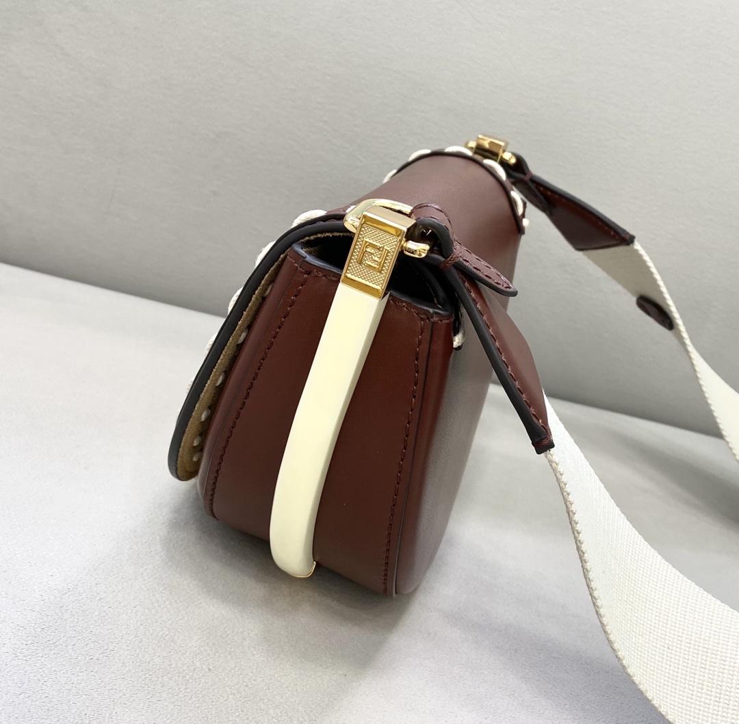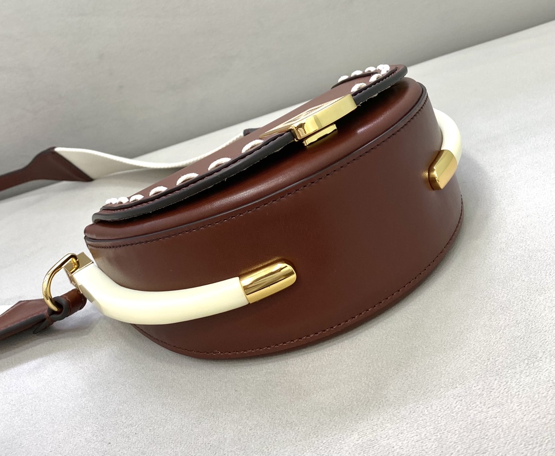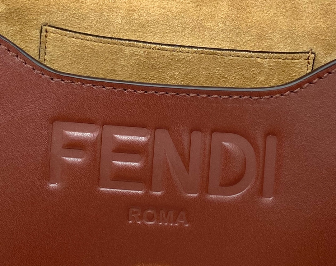 매끄러운 브라운 가죽 바디와 대비되는 화이트 스티치 디테일이 세련된 무드를 완성하며, 전면의 빈티지한 골드 톤 FF 로고 클로저가 브랜드 고유의 럭셔리함을 더합니다.