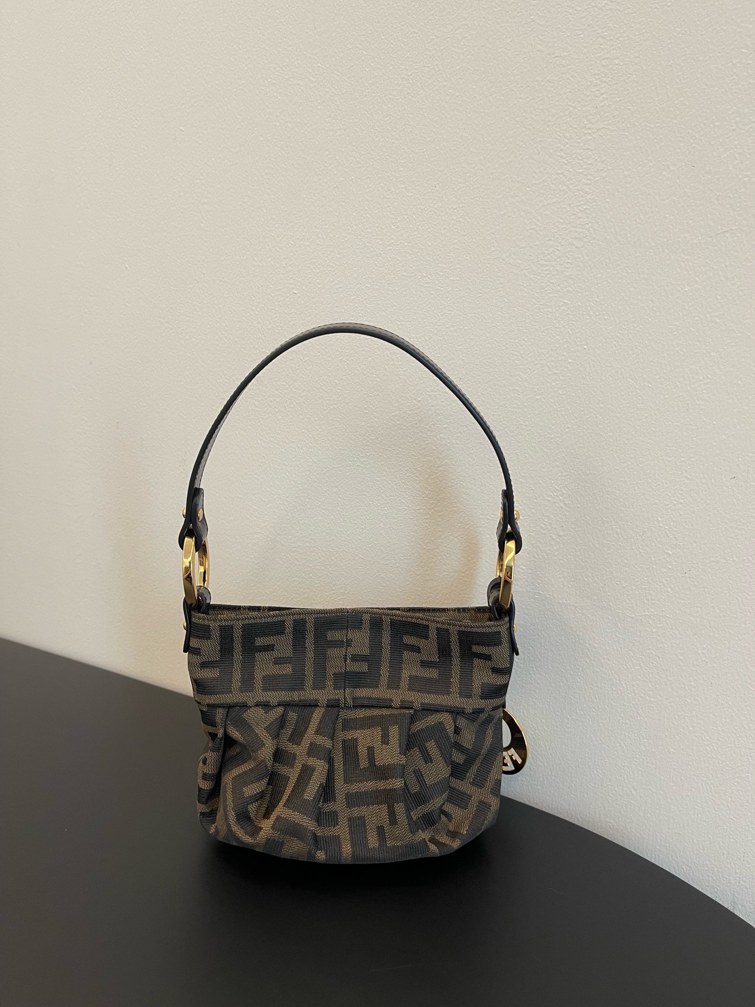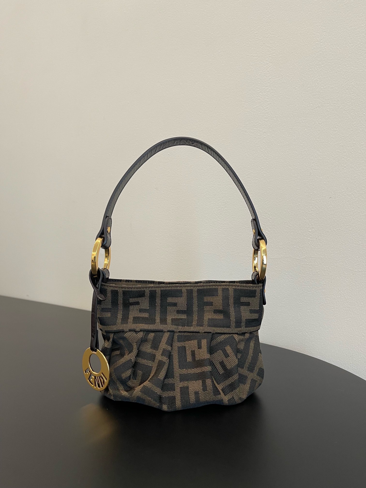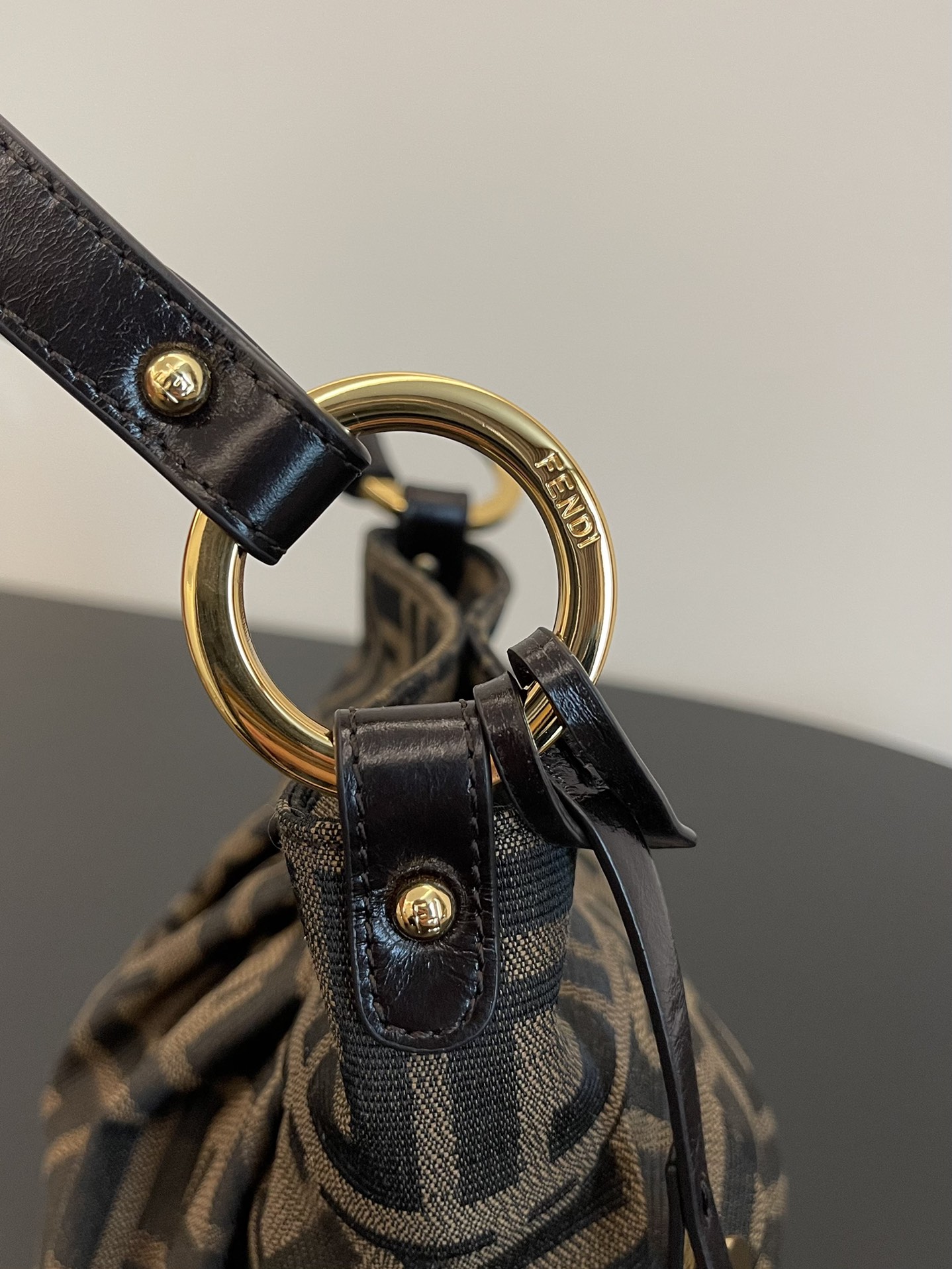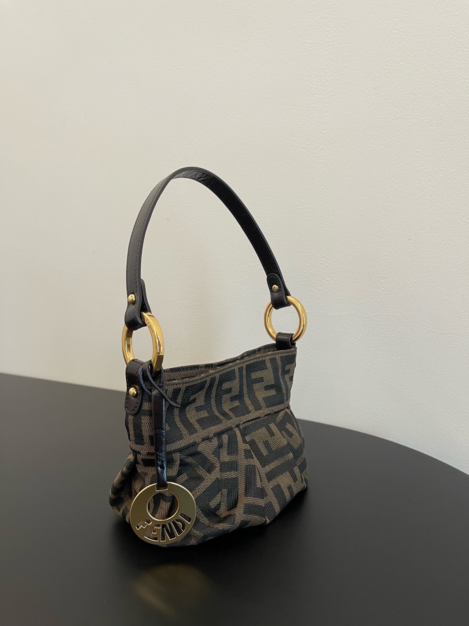상징적인 FF 주카 패턴 캔버스와 골드 톤의 링 하드웨어가 조화를 이루어 우아하면서도 빈티지한 매력을 완성합니다.