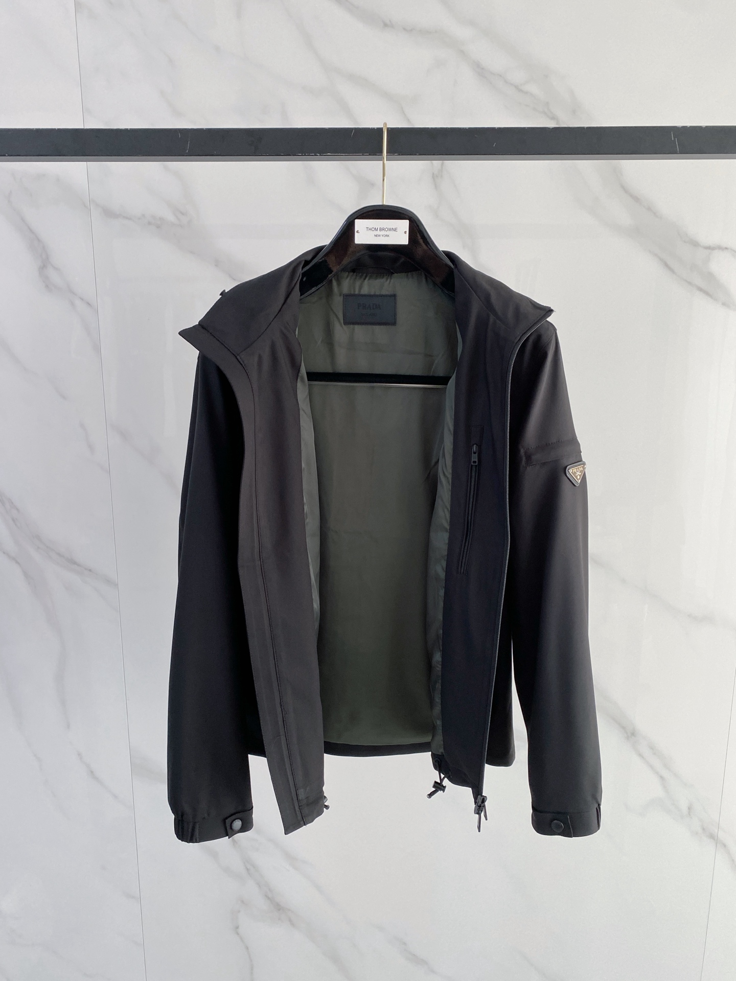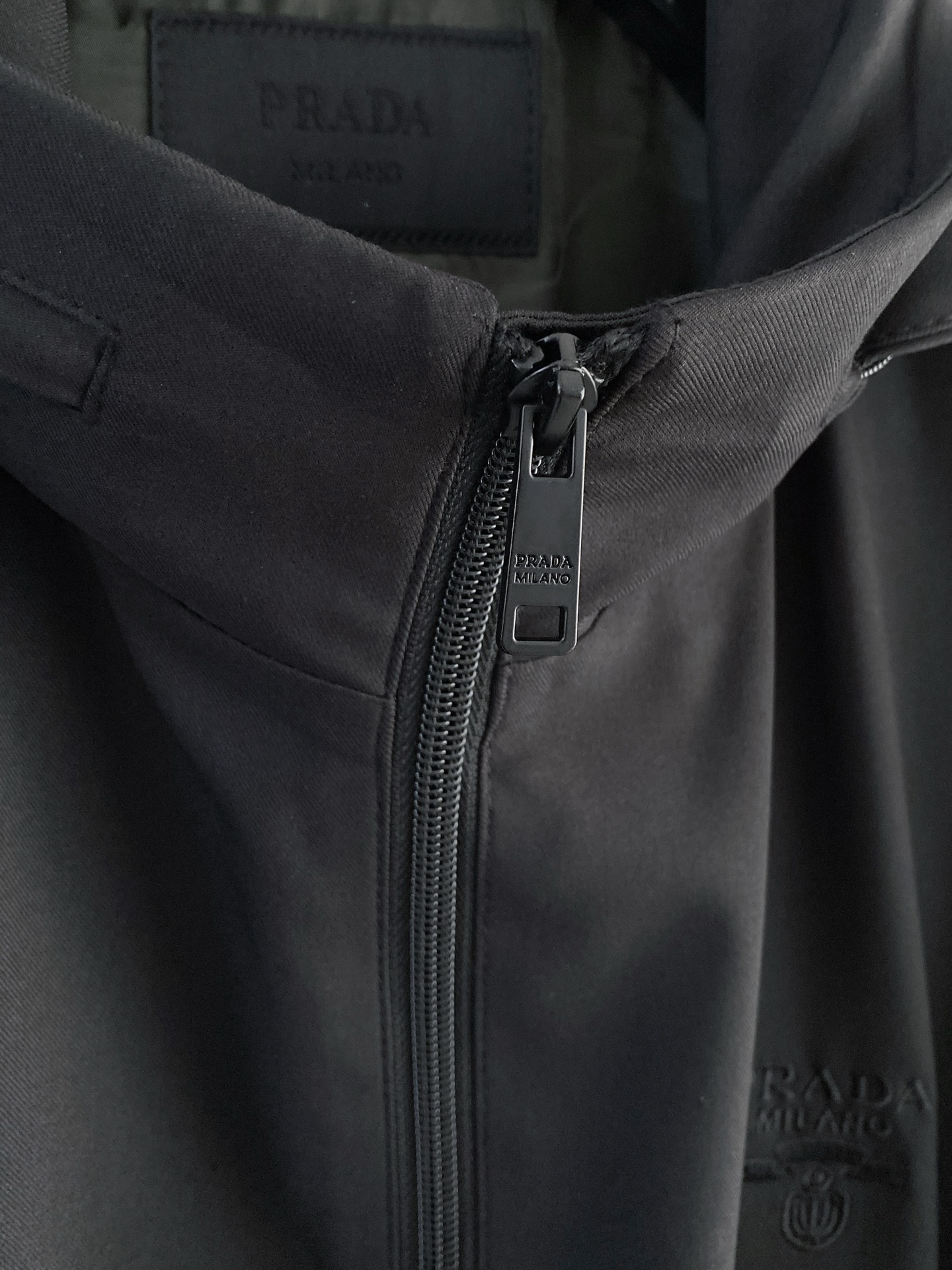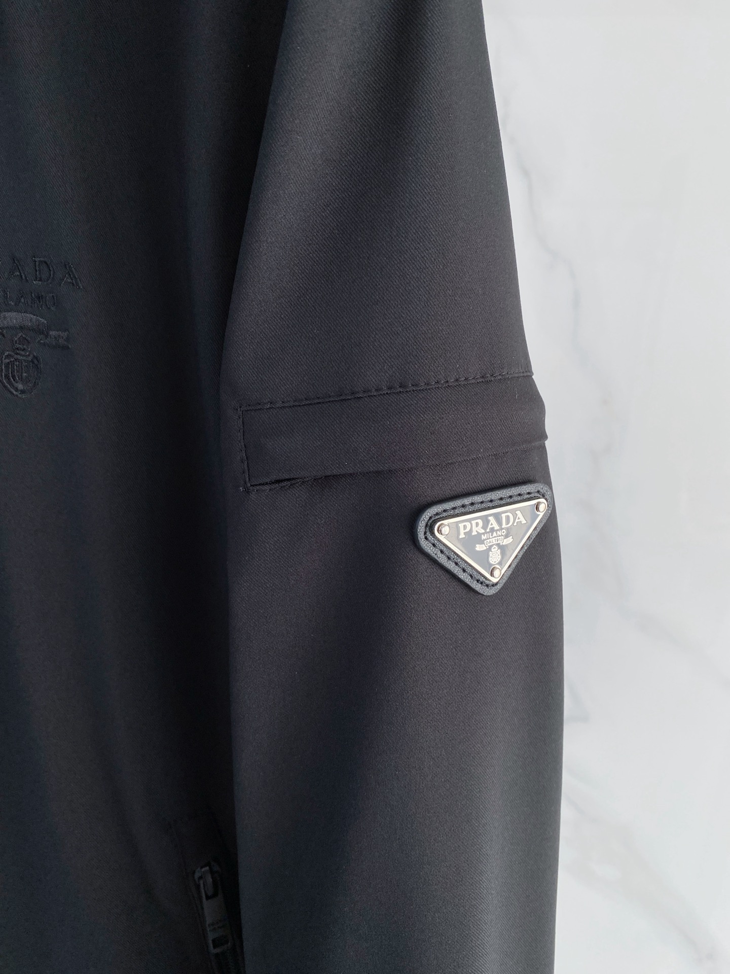 좌측 소매의 에나멜 메탈 트라이앵글 로고가 고급스러운 포인트가 되며, 세련된 블랙 컬러와 미니멀한 실루엣으로 데일리 룩부터 비즈니스 캐주얼까지 폭넓게 활용 가능한 베스트셀러 아이템입니다.
