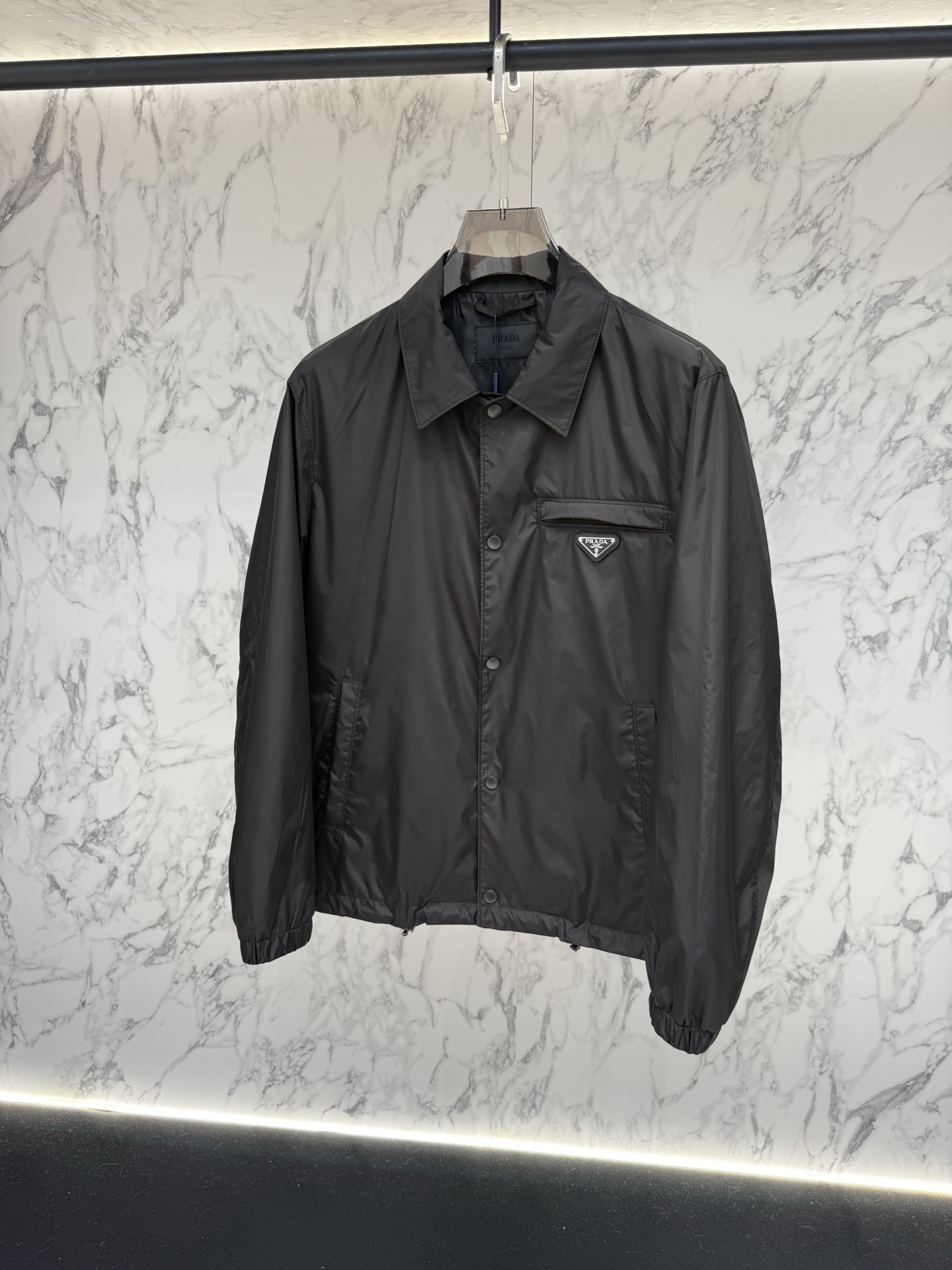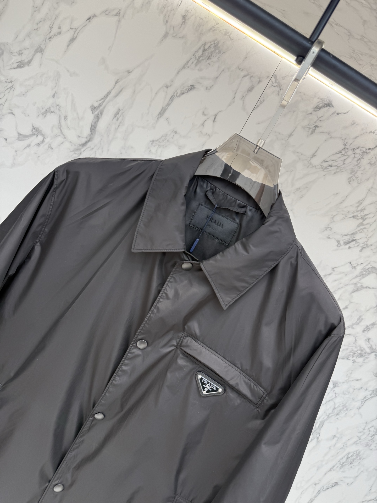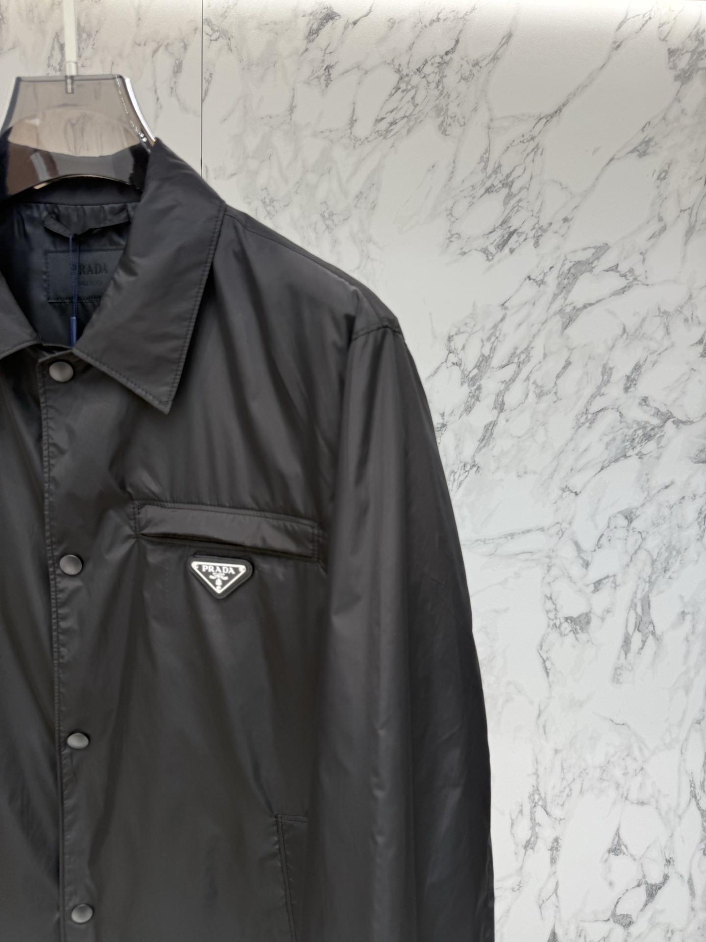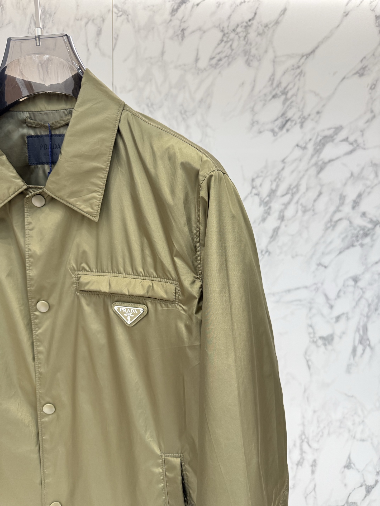 왼쪽 가슴 포켓의 에나멜 메탈 삼각형 로고가 프라다만의 독보적인 정체성을 드러내며, 친환경 리나일론 소재를 사용하여 가벼운 착용감과 탄탄한 내구성을 동시에 제공합니다.
