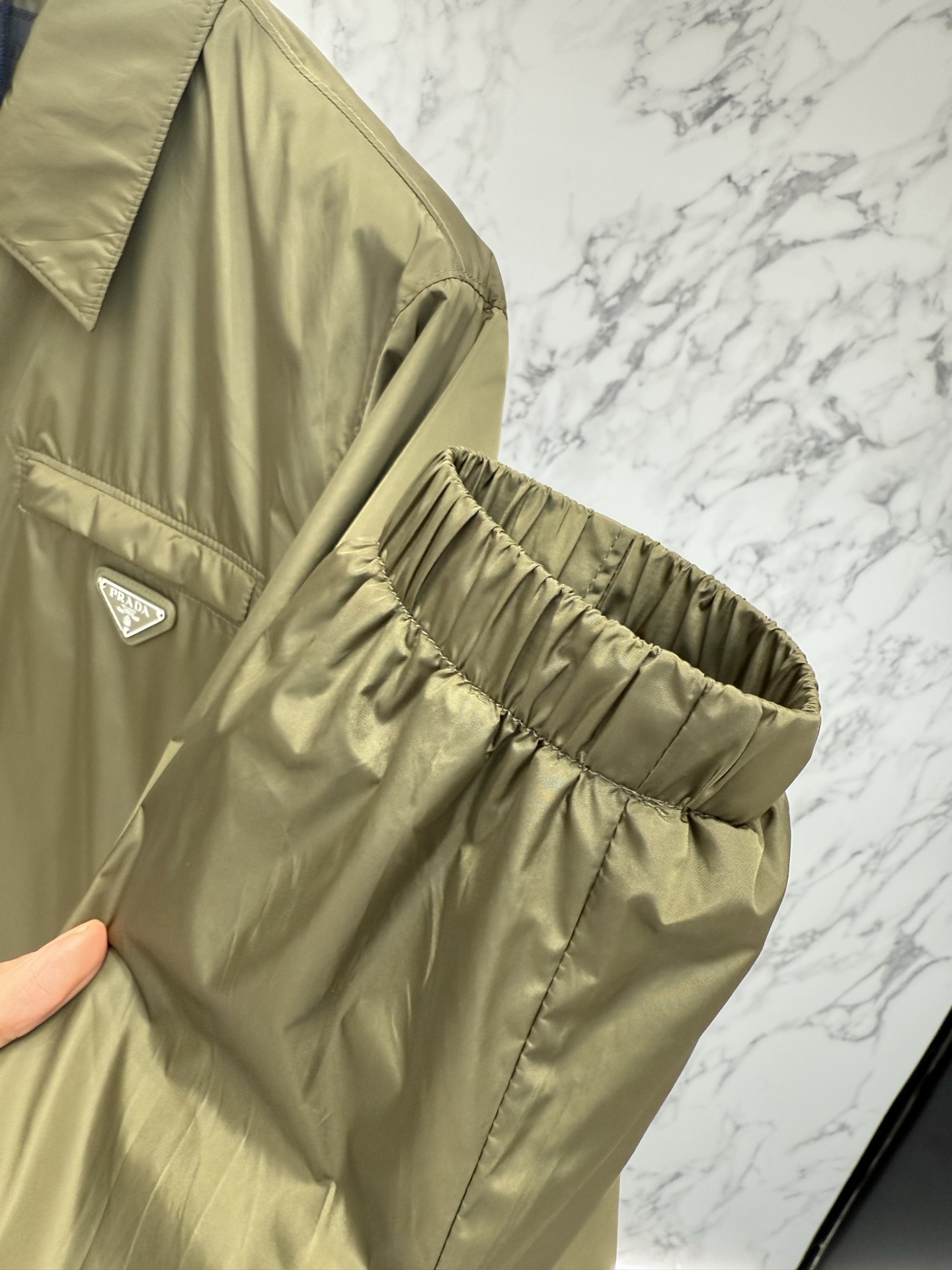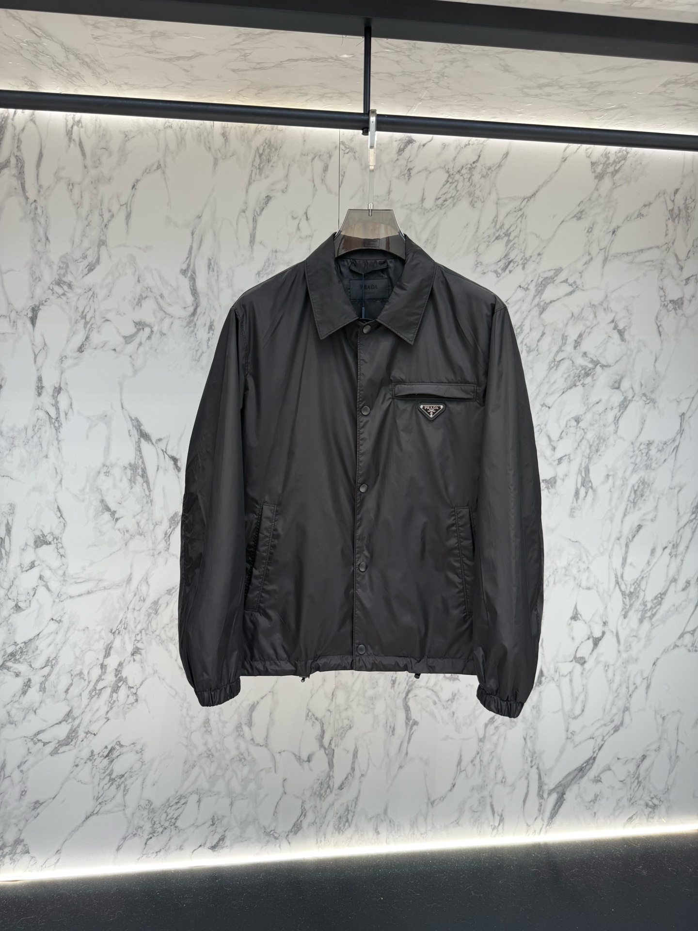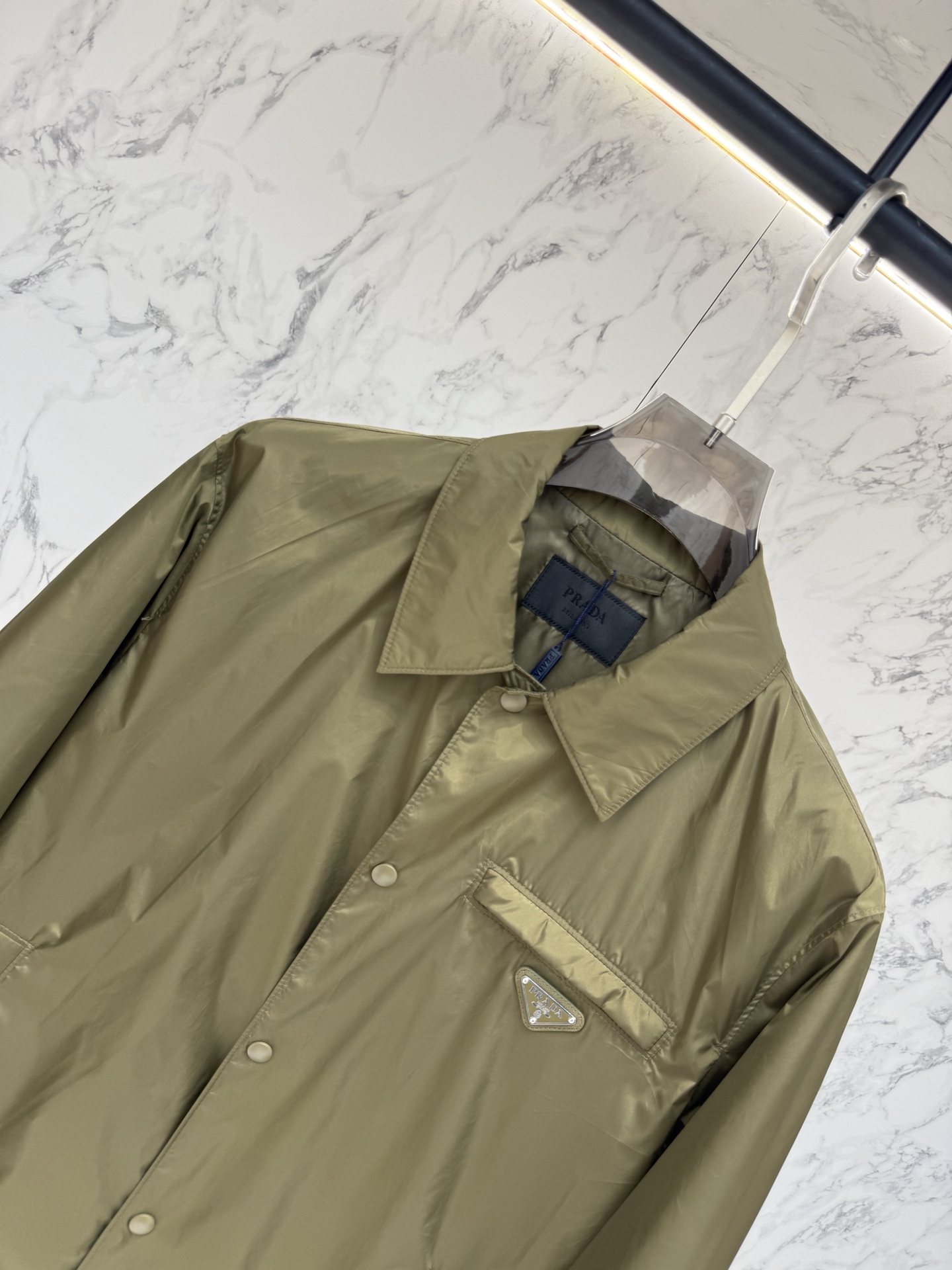 왼쪽 가슴 포켓의 에나멜 메탈 삼각형 로고가 프라다만의 독보적인 정체성을 드러내며, 친환경 리나일론 소재를 사용하여 가벼운 착용감과 탄탄한 내구성을 동시에 제공합니다.