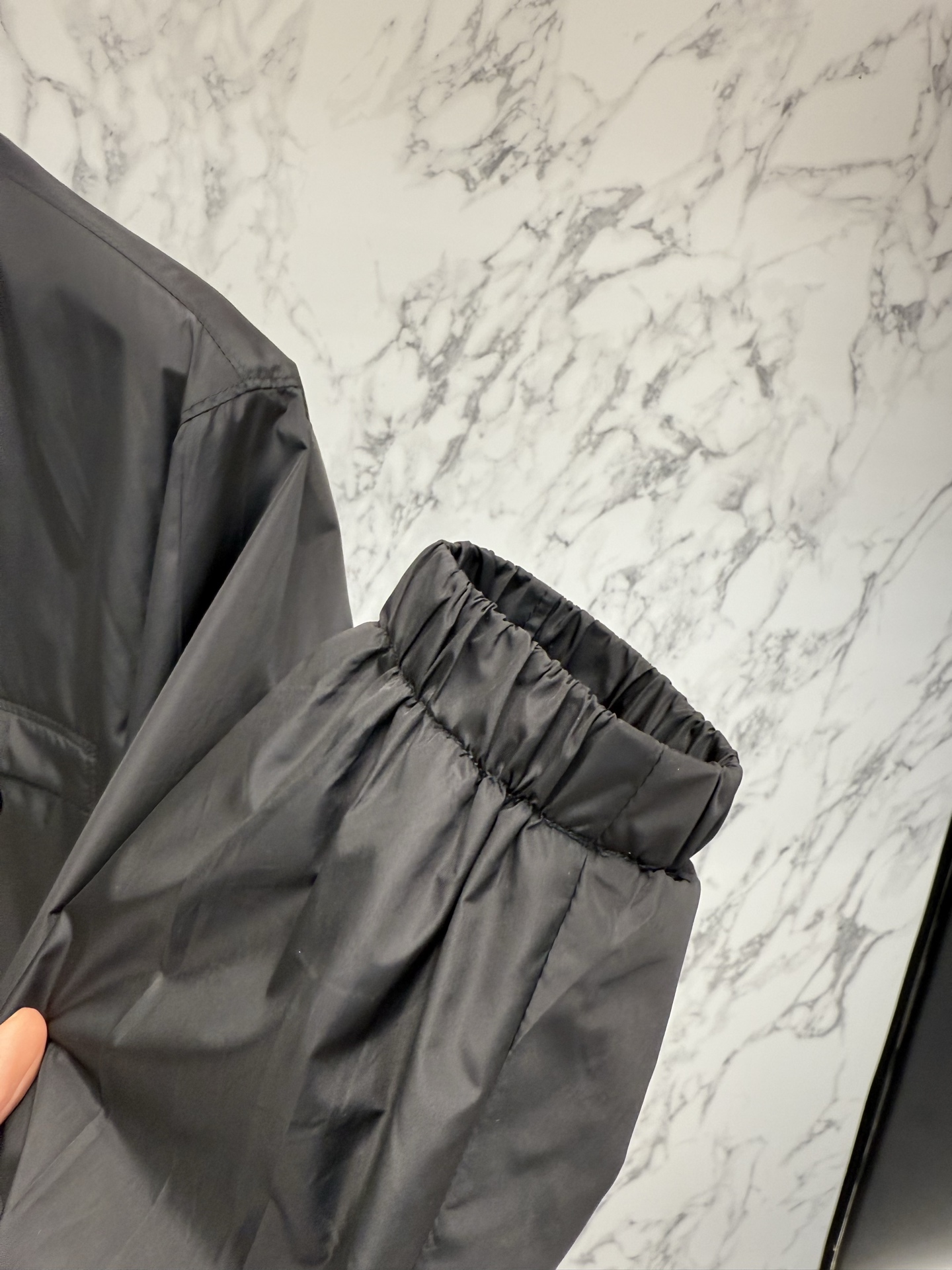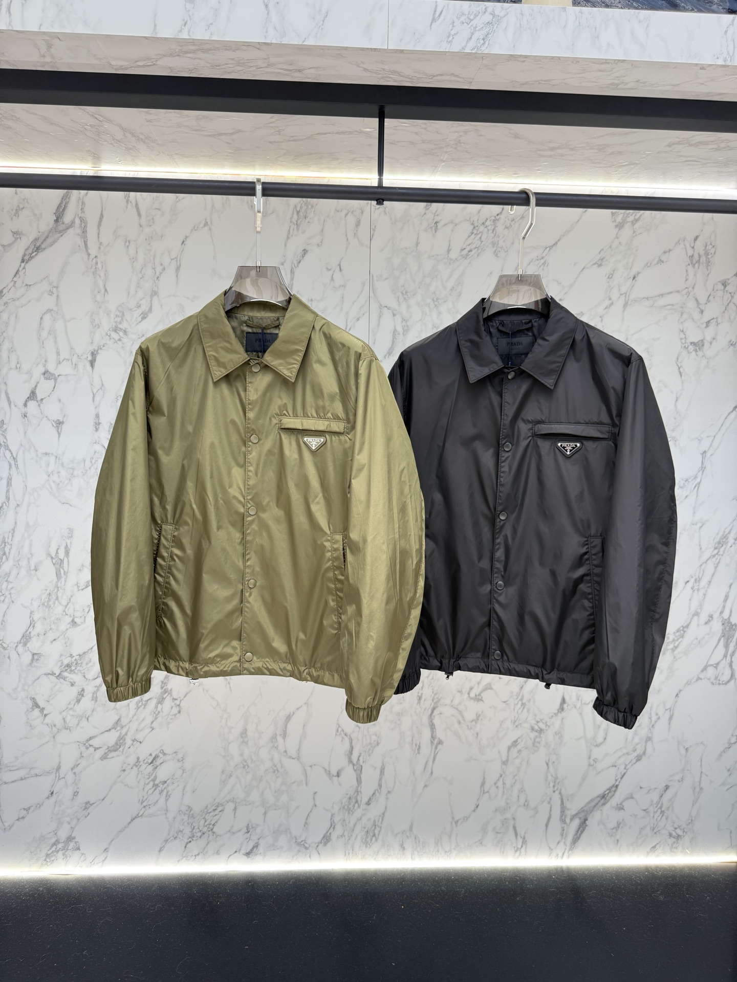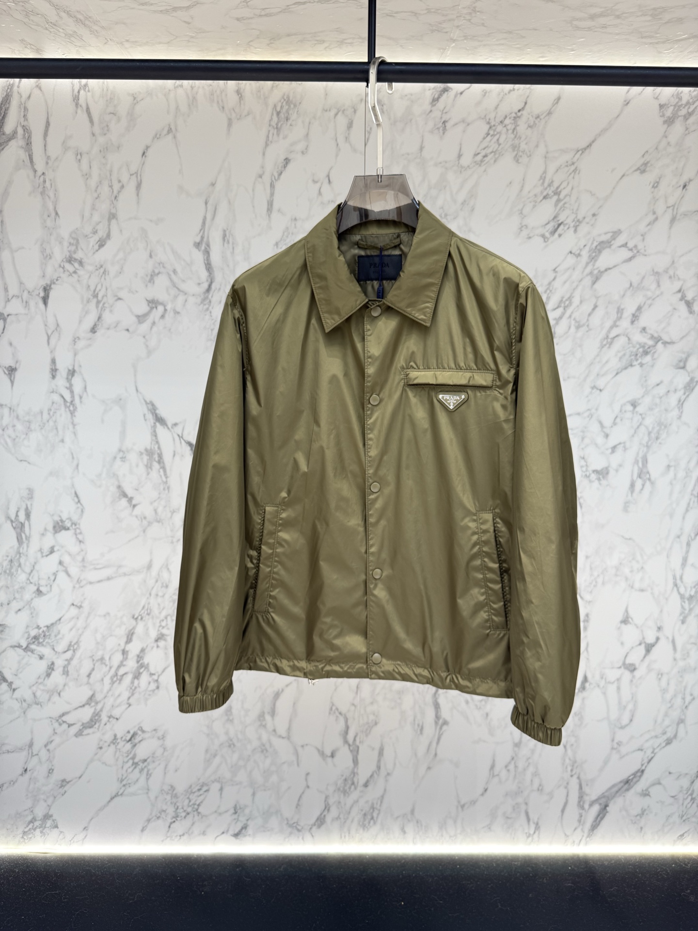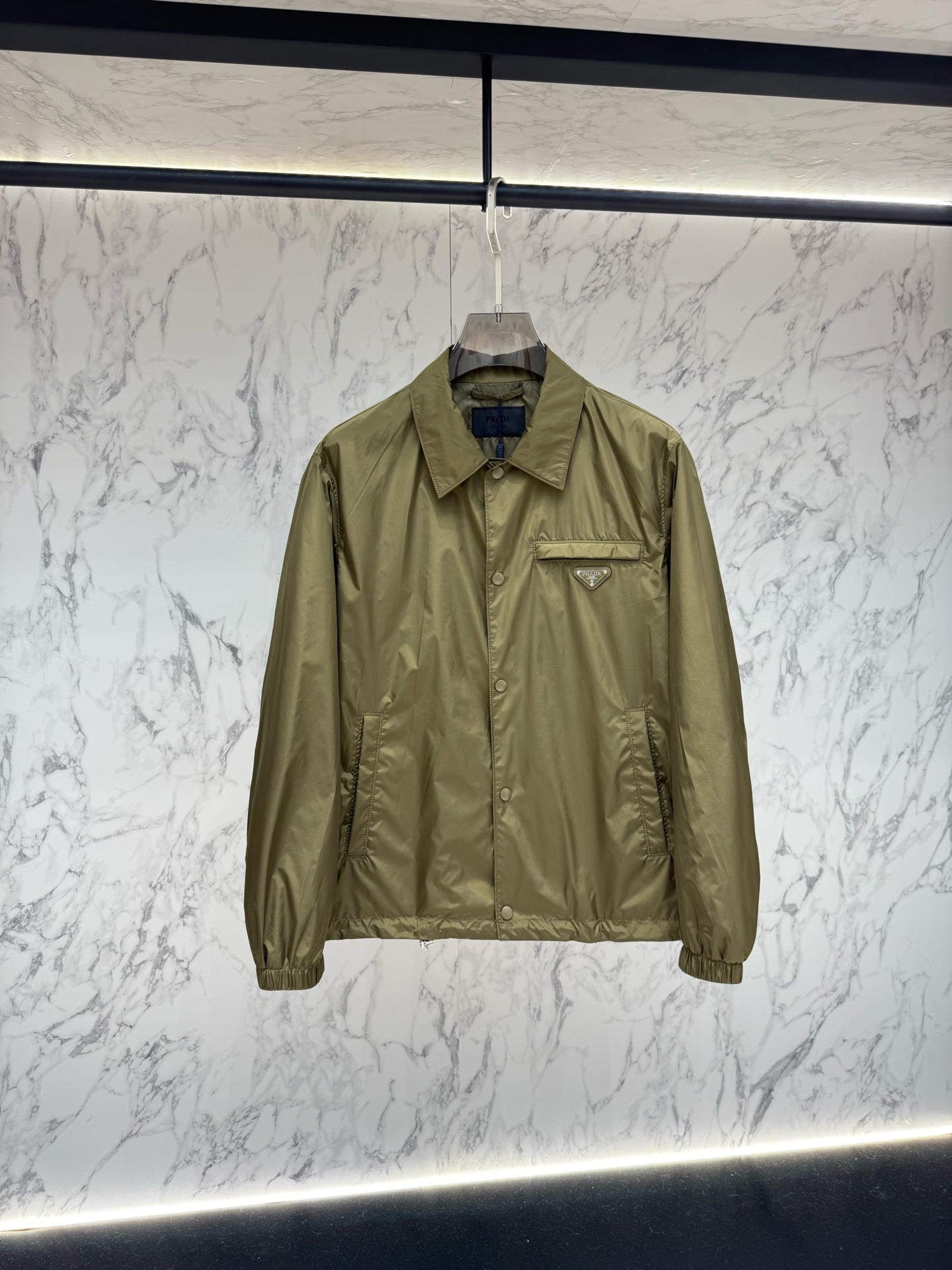 왼쪽 가슴 포켓의 에나멜 메탈 삼각형 로고가 프라다만의 독보적인 정체성을 드러내며, 친환경 리나일론 소재를 사용하여 가벼운 착용감과 탄탄한 내구성을 동시에 제공합니다.