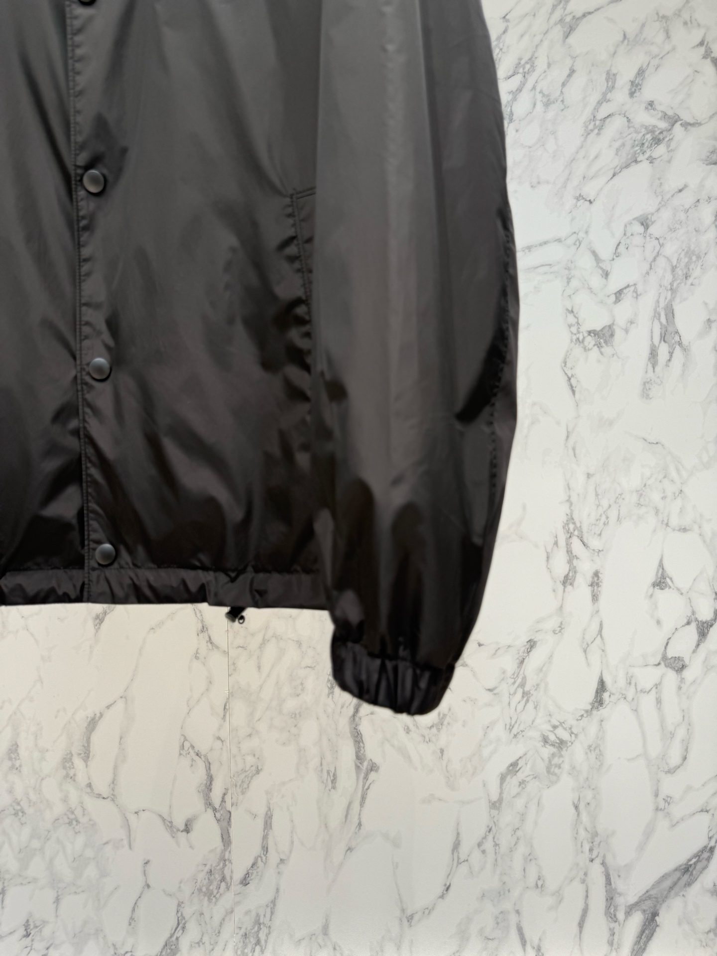 프라다(Prada)의 상징적인 소재와 미니멀한 디자인이 결합된 리나일론(Re-Nylon) 트라이앵글 로고 코치 자켓입니다.