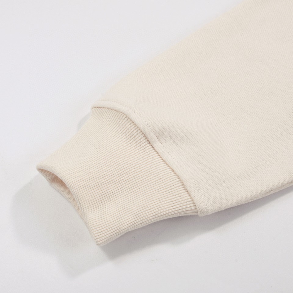 420g 커스텀 순면 테리 원단과 립 조직 적용.고온 열프린팅 공정으로 세탁 및 고온에도 견고한 내구성, 깔끔한 더블 스티치 마감.택·워시라벨·메인라벨 1:1 커스텀 및 패키지 구성, 남녀 공용.