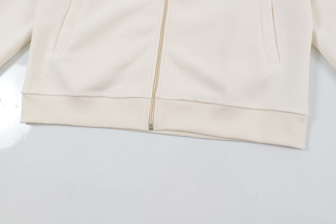 460g 더블 레이어 에어 원단과 소로나 립 조직 정염 가공 적용.일본 시마다 자수 기계로 제작한 로고 자수와 YKK 스탠다드 커스텀 지퍼 사용, 캐주얼 스포츠 무드의 아우터.전신 커스텀 부자재 구성.